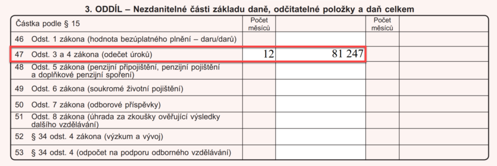 Do třetího oddílu daňového přiznání (řádek 47) vepište částku, kterou jste v minulém roce zaplatili na úrocích z úvěru na bydlení nebo hypotéky. Přesnou částku najdete na potvrzení z banky (to vám pošle samotná banka, případně ho můžete stáhnout ve svém internetovém bankovnictví).