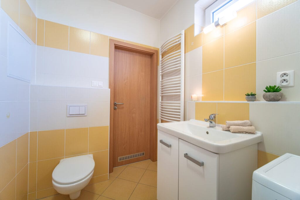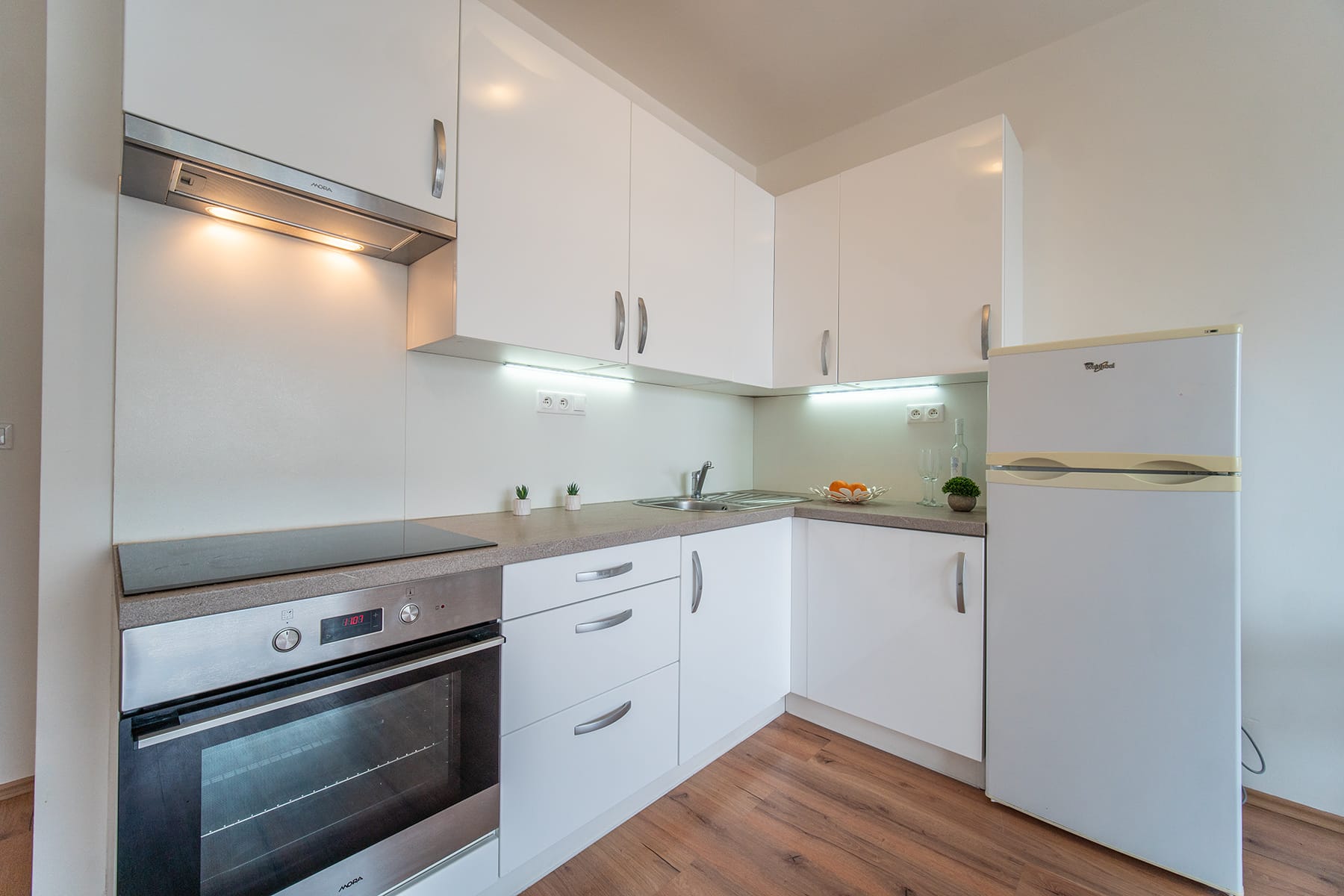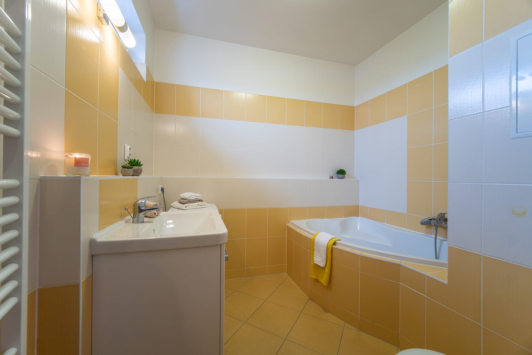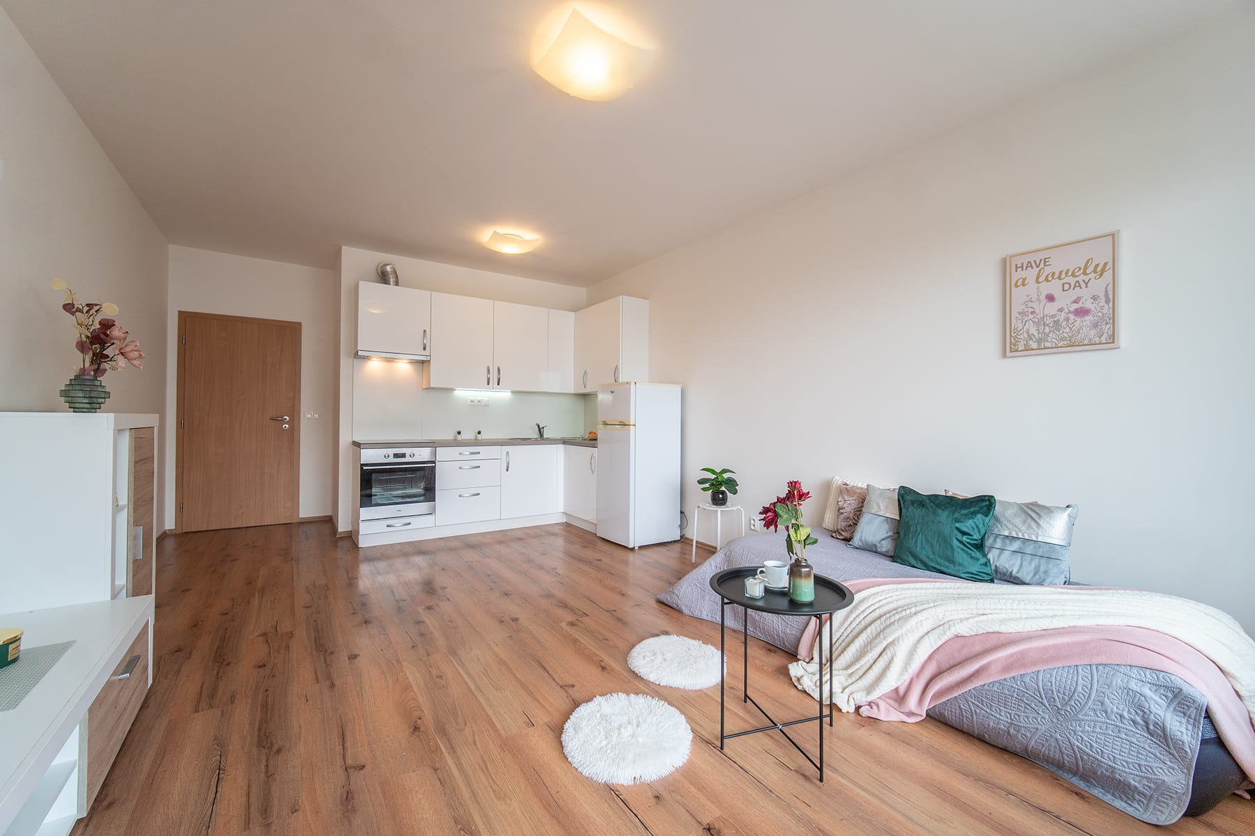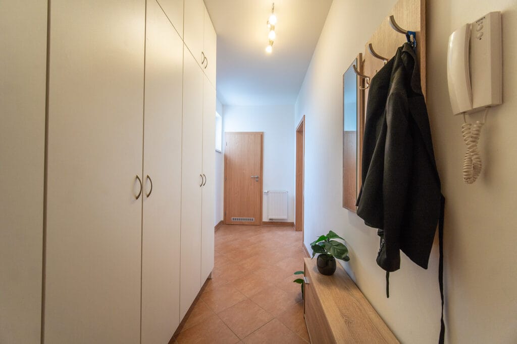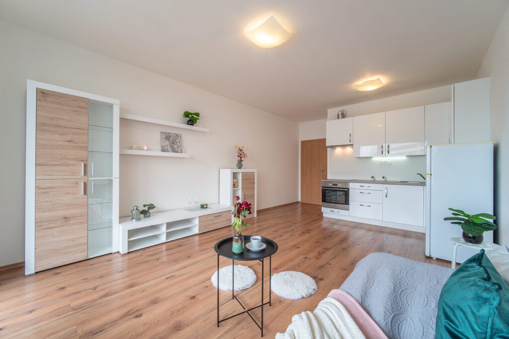 Kuchyňská linka obsahuje vestavěné spotřebiče: indukční varnou desku s elektrickou troubou, digestoř a samostatně stojící ledničku s mrazákem. V obývacím pokoji je obývací stěna, závěsné poličky a stůl pod TV. V prostorné a světlé koupelně s oknem se nachází rohová vana, umyvadlo, toaleta a automatická pračka. Byt dále zůstane vybaven i nábytkem na chodbě, který byl dělaný na míru – objemná vestavěná skříň, věšáková stěna se zrcadlem a botníkem.