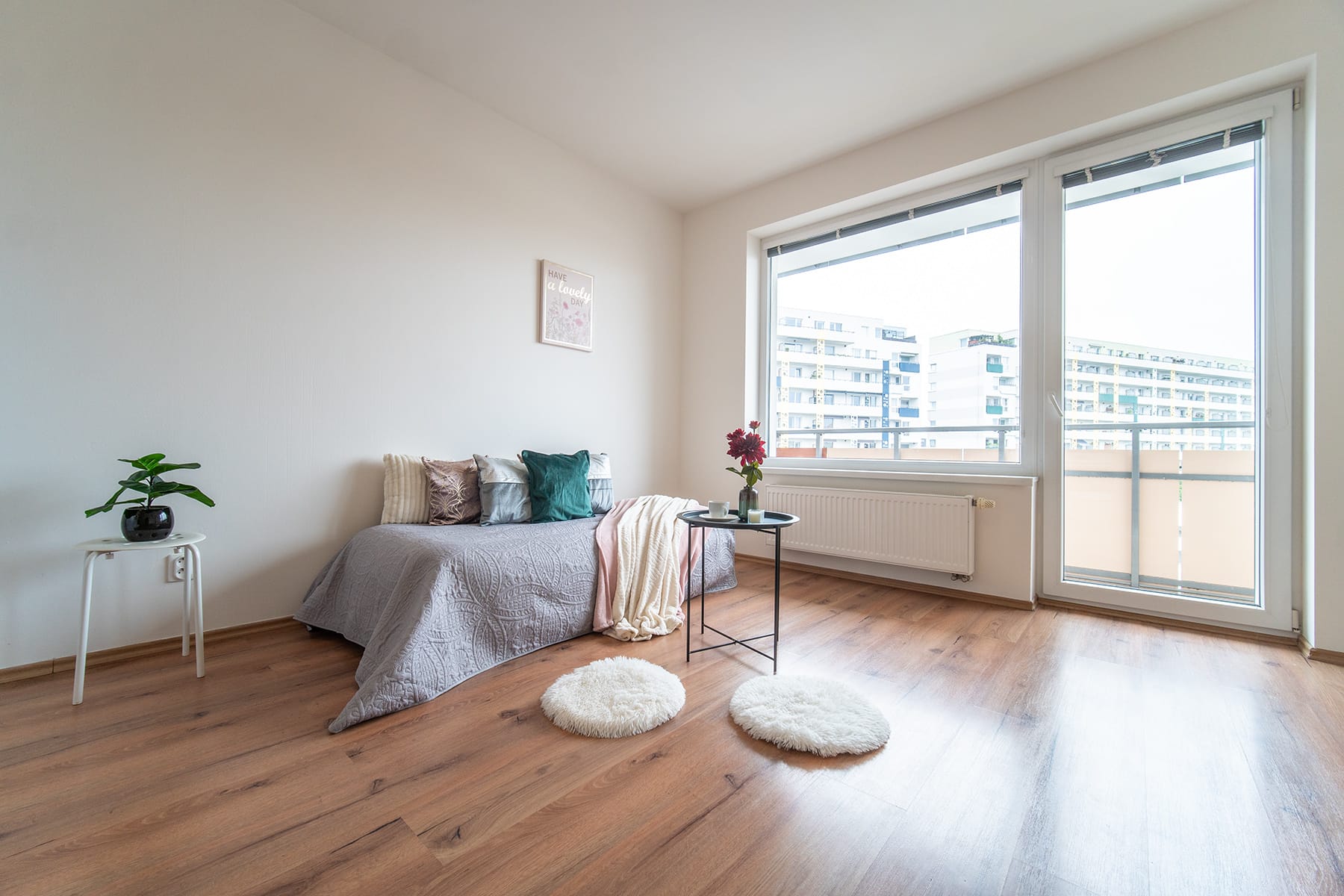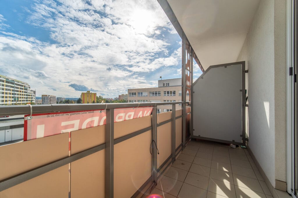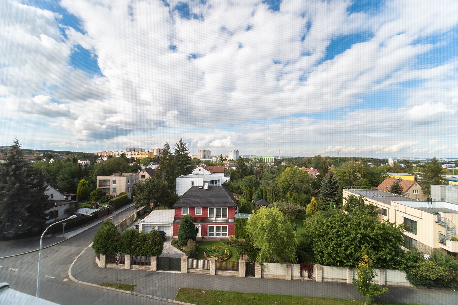 Okno v obývacím pokoji se vstupem na balkón je orientováno na jih a díky tomu je byt světlý a teplý, to je jeho největší výhoda. V zimě do bytu svítí slunce a v létě slunce odstíní střecha nad balkónem. Okna v ložnici, na chodbě a v koupelně jsou orientována na severní stranu. Okna jsou plastová s vnitřními žaluziemi a opatřena sítěmi proti hmyzu.