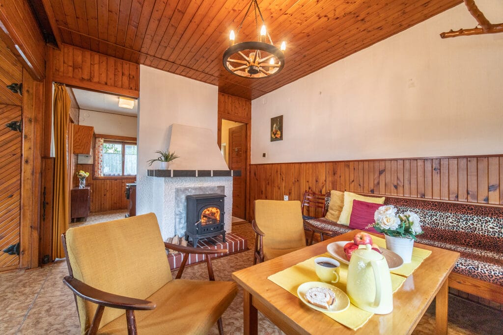 TOPENÍ: lokální na tuhá paliva – Petry v kuchyňském koutě, krb a americká kamna v obývacím pokoji.