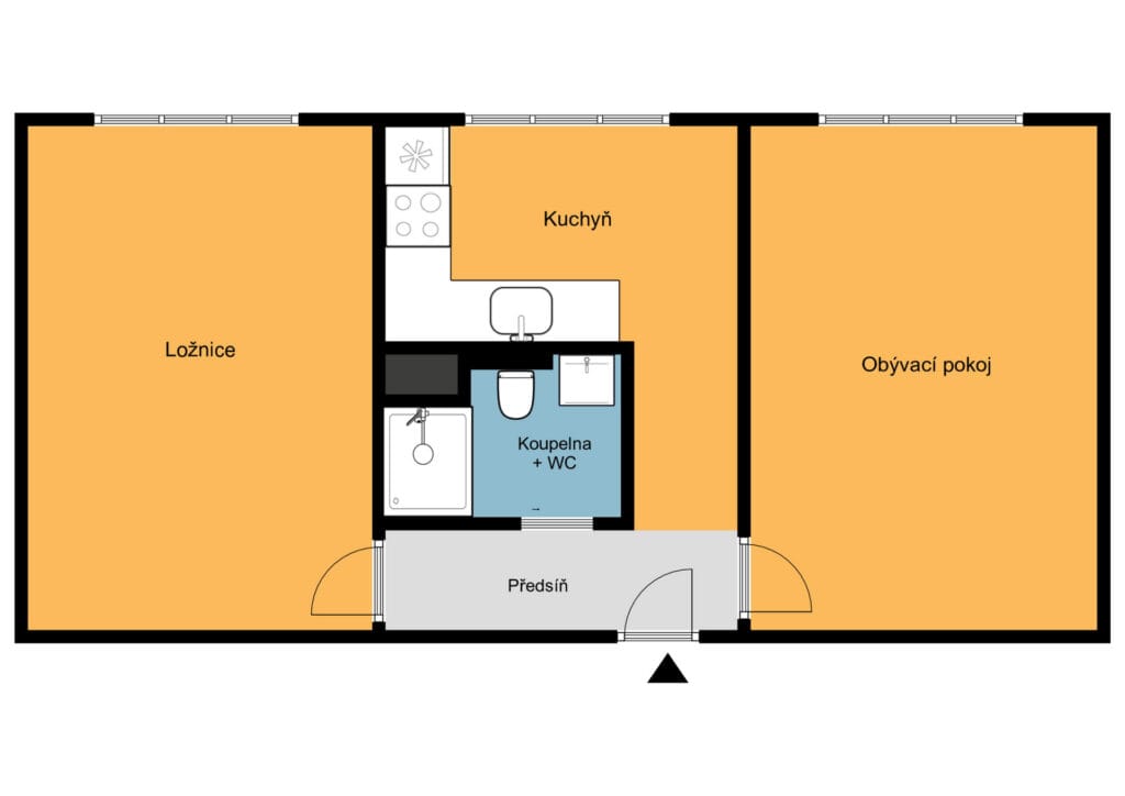 Dispozice bytu zahrnuje chodbu, kuchyni, koupelnu s WC, ložnici a obývací pokoj. K bytu náleží také sklepní kóje o velikosti cca 1 m² a sdílený balkon v mezipatře.