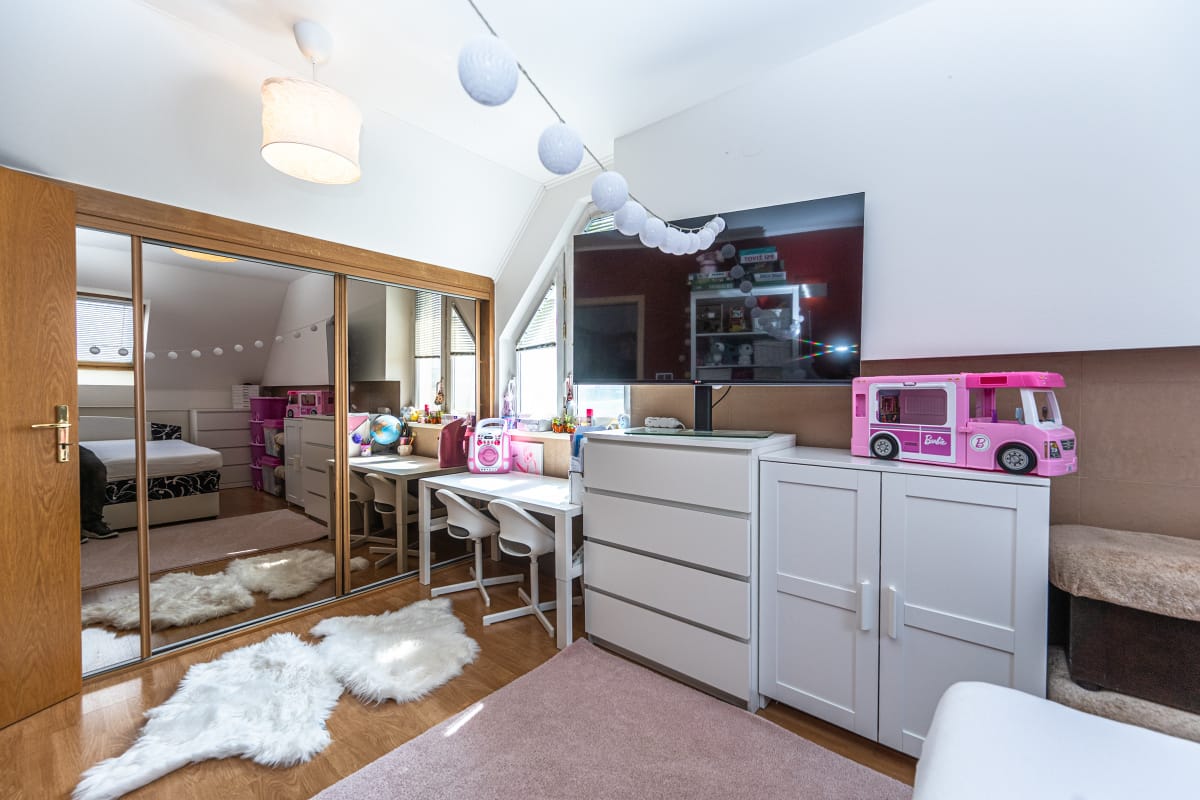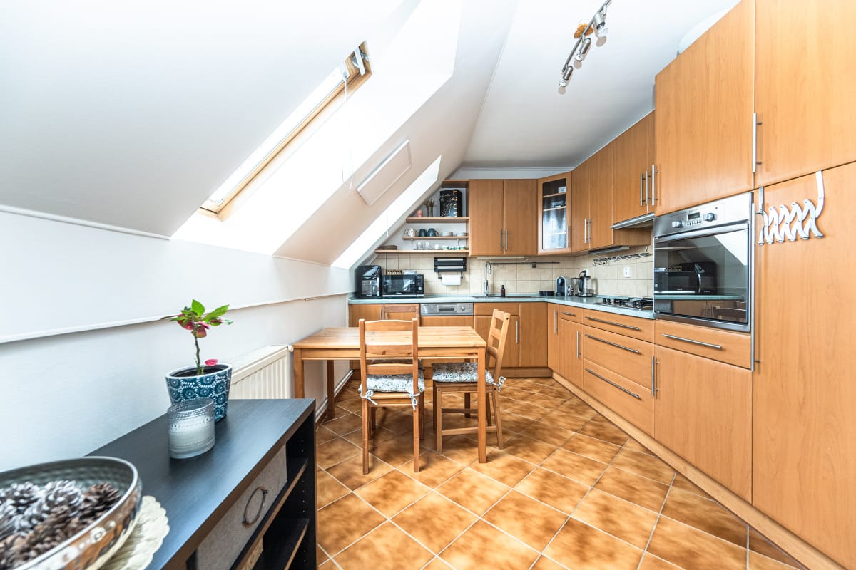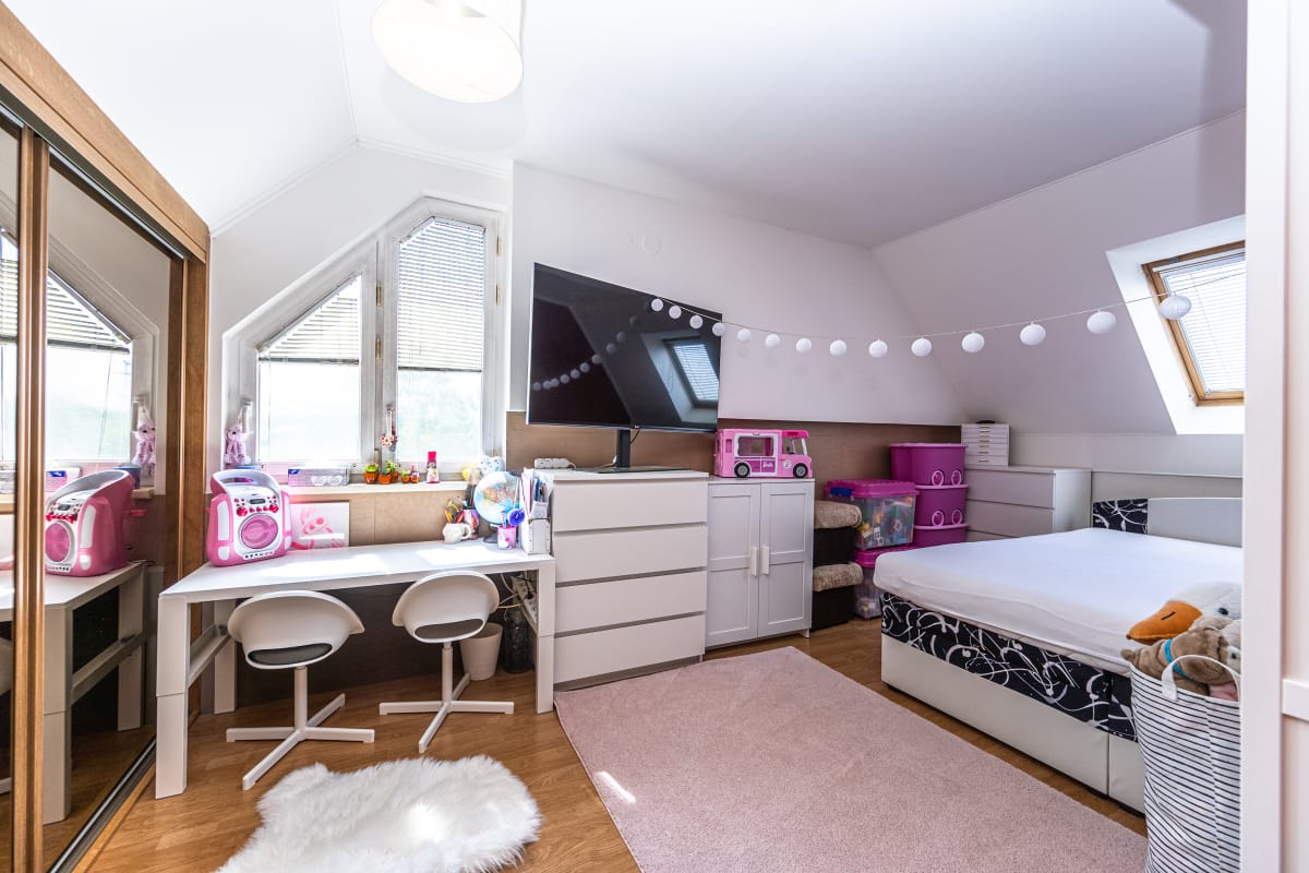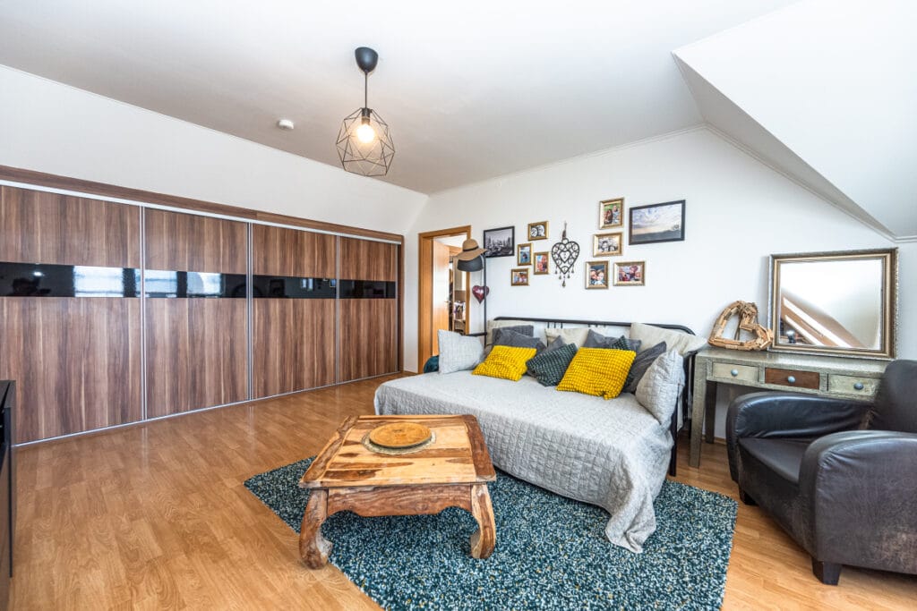 V obývacím pokoji a ložnici je plovoucí podlaha, v ostatních místnostech dlažba. Okna jsou plastová s vnitřními žaluziemi, v ložnici a kuchyni jsou okna střešní.