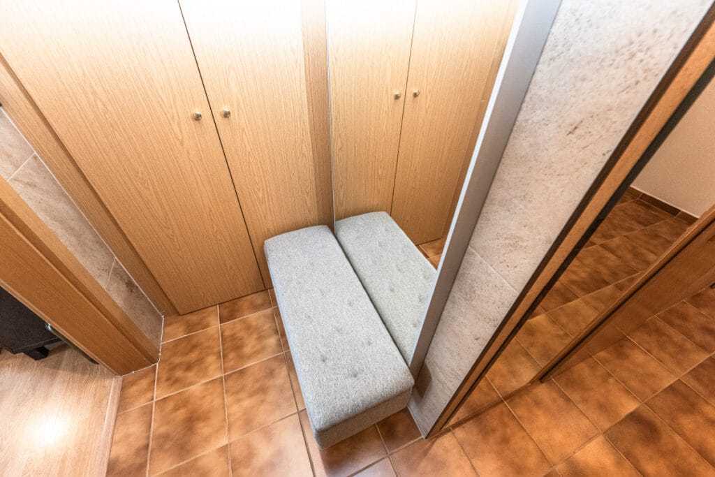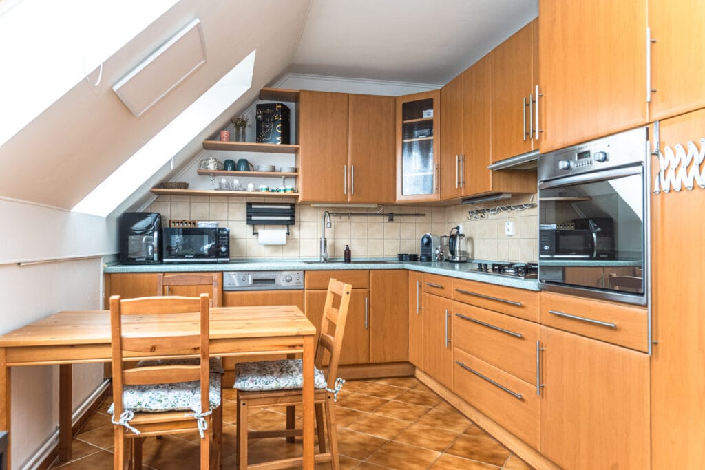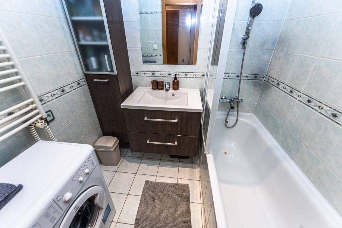 Byt je vybaven kuchyňskou linkou se spotřebiči (plynová varná deska, elektrická trouba, digestoř, myčka, lednice s mrazákem), jídelním stolem a židlemi. V ložnici najdete vestavěnou skříň a dvojlůžko, v obývacím pokoji vestavěnou skříň, TV stolek, rozkládací lůžko/gauč se zdravotními matracemi, TV a další úložné prostory. V koupelně je vana, termostatická vanová baterie, sprchová zástěna, umyvadlo, skříňka pod umyvadlem, automatická pračka a otočný kombinovaný žebřík.