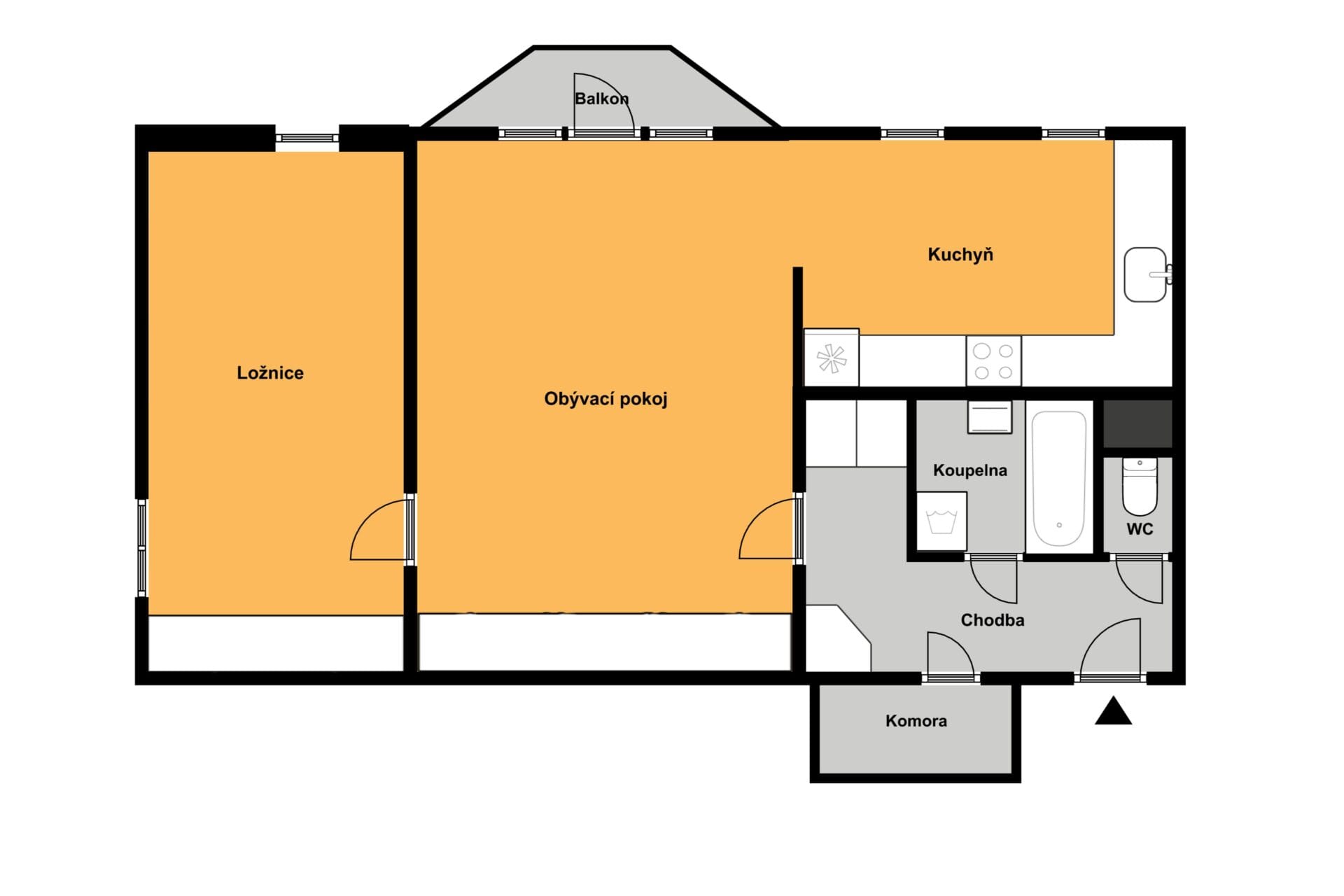 Byt je prakticky dispozičně řešen a nabízí dostatek prostoru pro komfortní bydlení. Skládá se z předsíně (5,36 m²), komory (2,22 m²), WC (0,98 m²), koupelny (4,77 m²), obývacího pokoje (23,69 m²), ložnice (16,67 m²), kuchyně (11,42 m²), balkónu (1,6 m²) a sklepa (1,35 m²).
