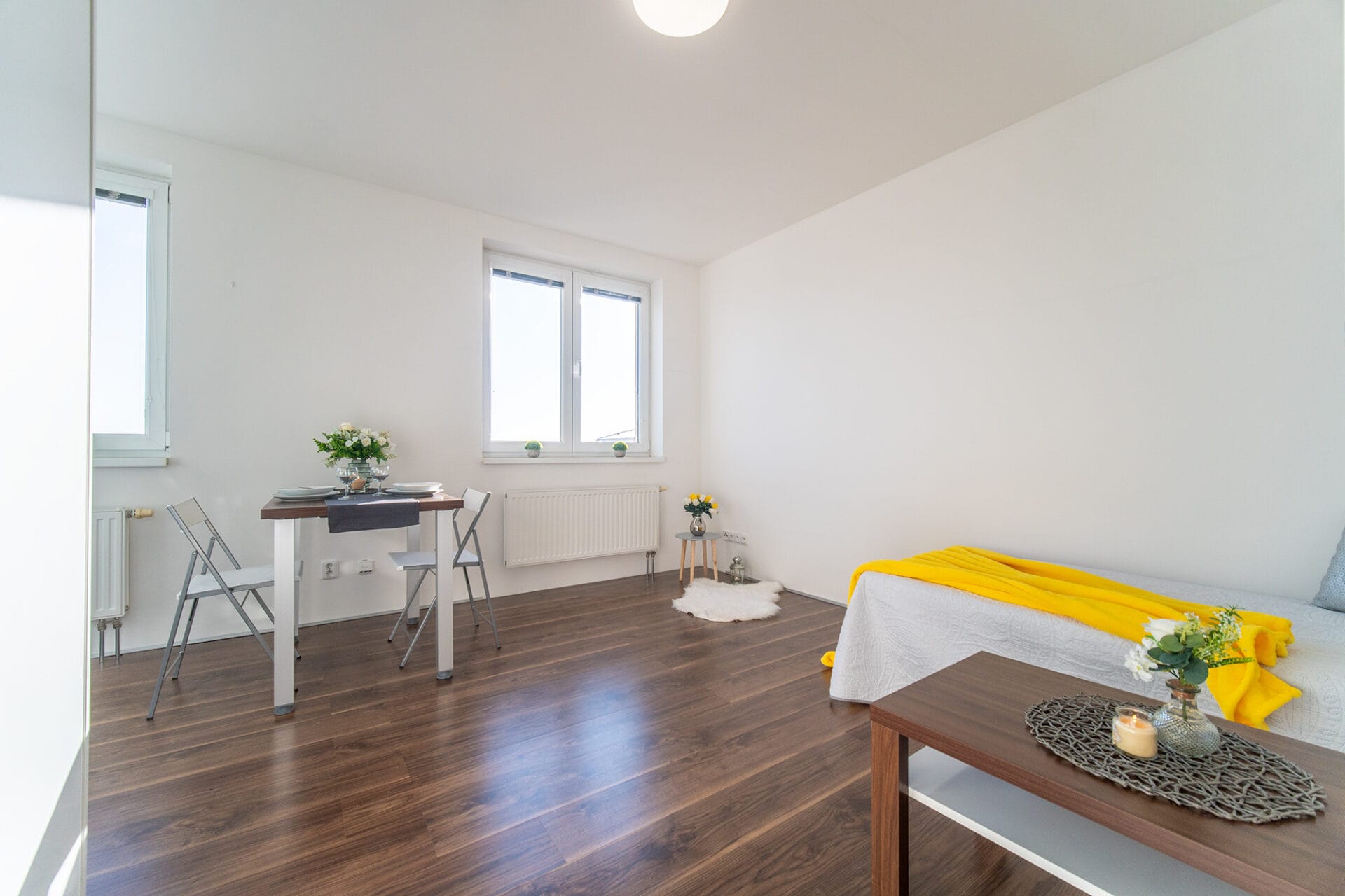 Byt je ve velmi dobrém stavu, je zařízený a tak je možné ho okamžitě užívat bez nutnosti dalších investic. Kuchyňská linka je vybavena vestavěnými spotřebiči – lednice s mrazákem, elektrická trouba, mikrovlnná trouba, myčka, sklokeramická deska. Byt je dále vybaven jídelním stolem se židlemi, postelí a druhou vyklápěcí postelí, díky které bude váš spánek kvalitní a přesto budete mít v bytě dost místa. Plastová okna se žaluziemi jsou orientovaná jižním směrem.