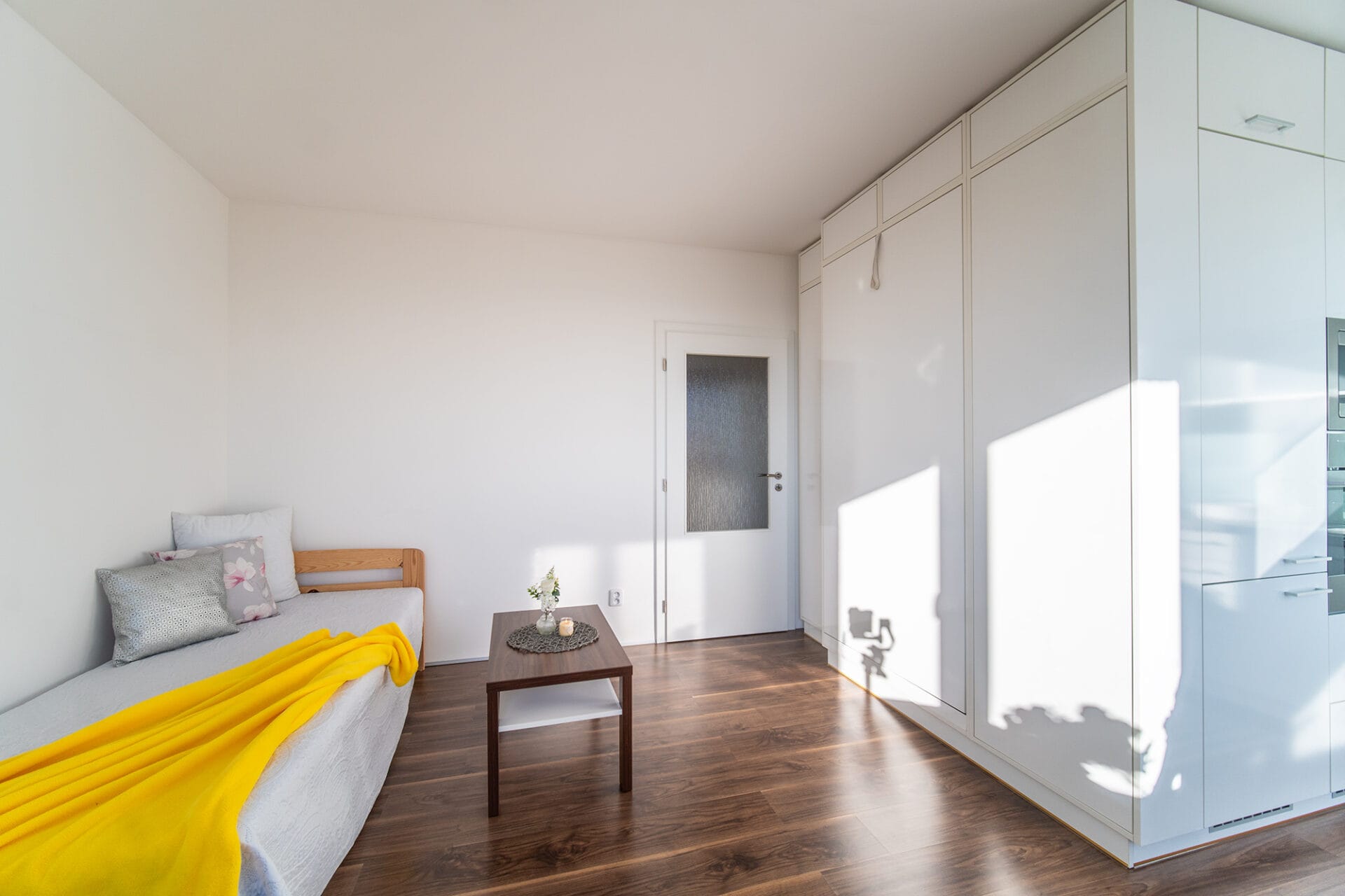 Interiér bytu tvoří světlý obývací pokoj s kuchyňským koutem (20,39 m2), koupelna s vanou a toaletou (4,47 m2), vstupní chodba (2,45 m2) a šatna (2,54 m2).