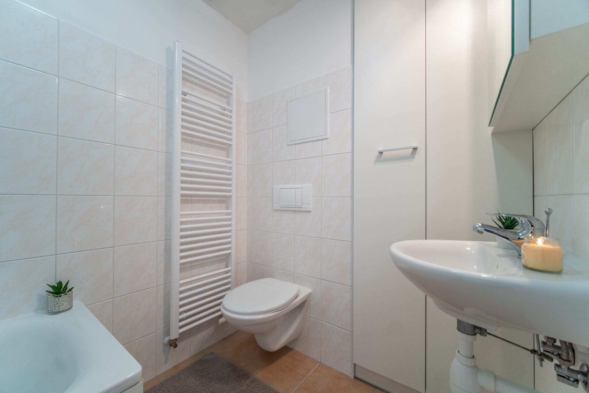 V koupelně je vana, automatická pračka a praktická vestavěná skříň. Pro uložení věcí slouží šatna se zabudovanými policemi.