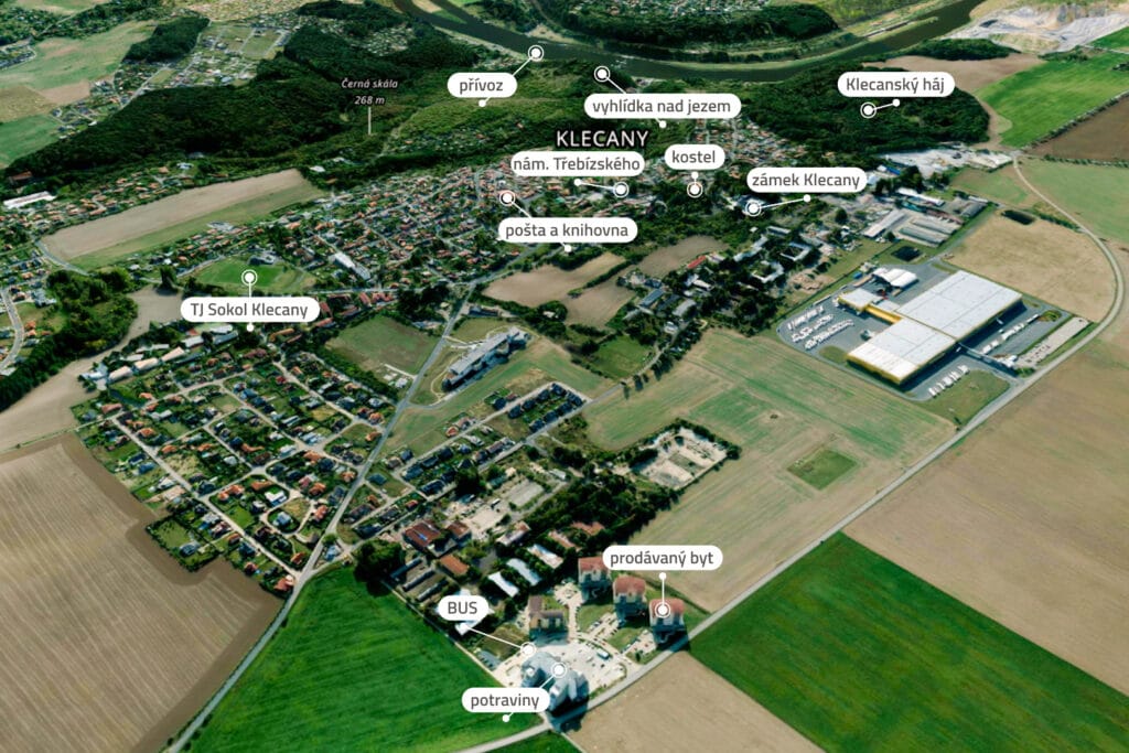 Klecany leží jen 5 km severně od okraje Prahy na pravém břehu Vltavy a díky skvělé dopravní dostupnosti a krásné přírodě jsou velmi žádanou lokalitou. Sportovci využívají cyklostezku podél Vltavy, která je vhodná i k příjemným procházkám. Ve městě je večerka se smíšeným zbožím (naproti domu), na náměstí potraviny, útulná kavárna i příjemná restaurace.