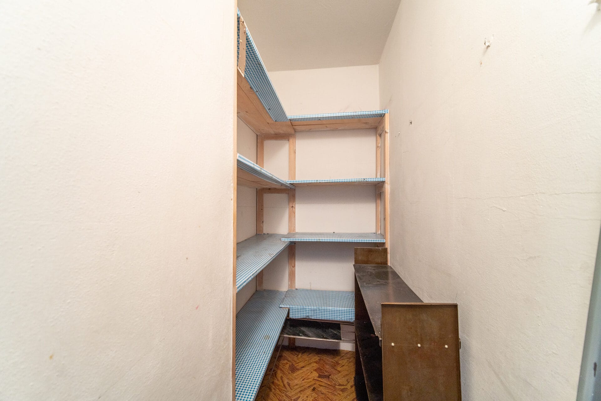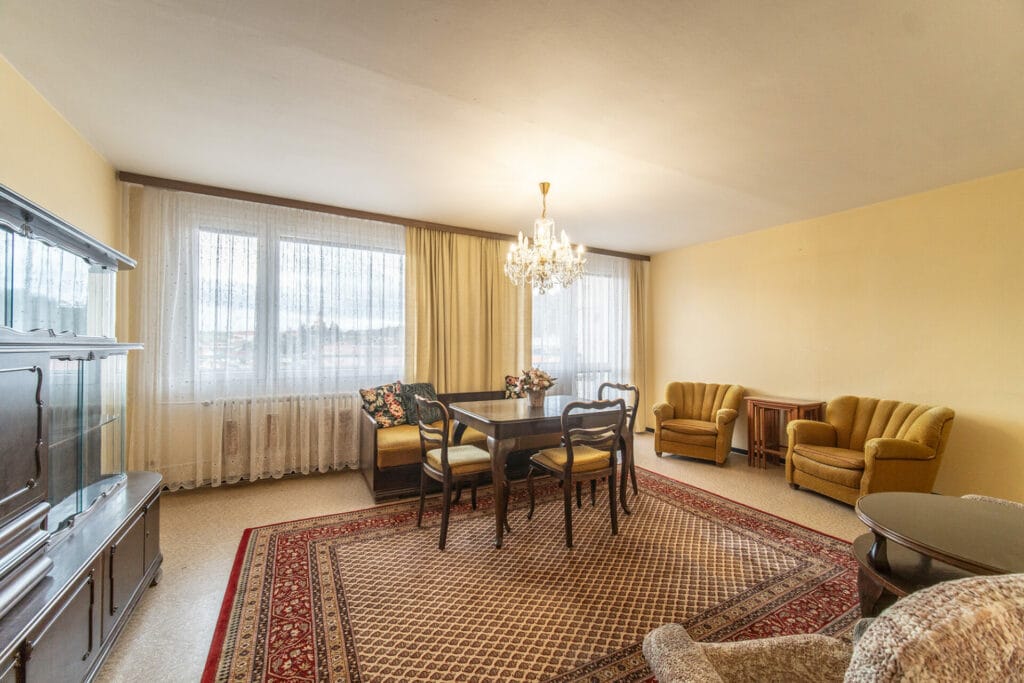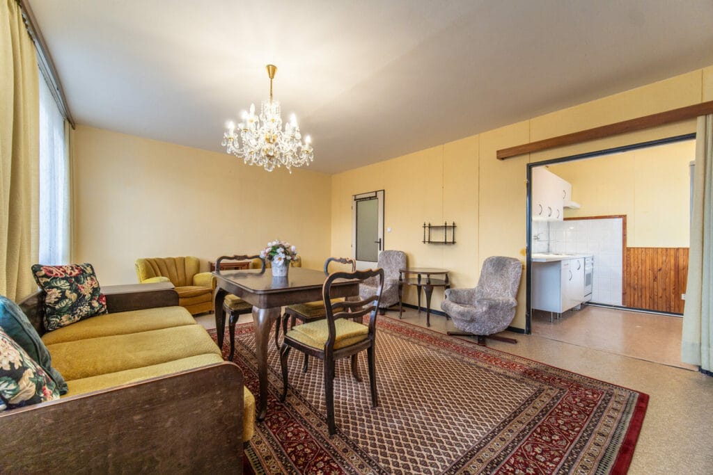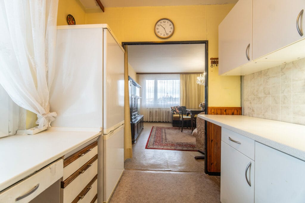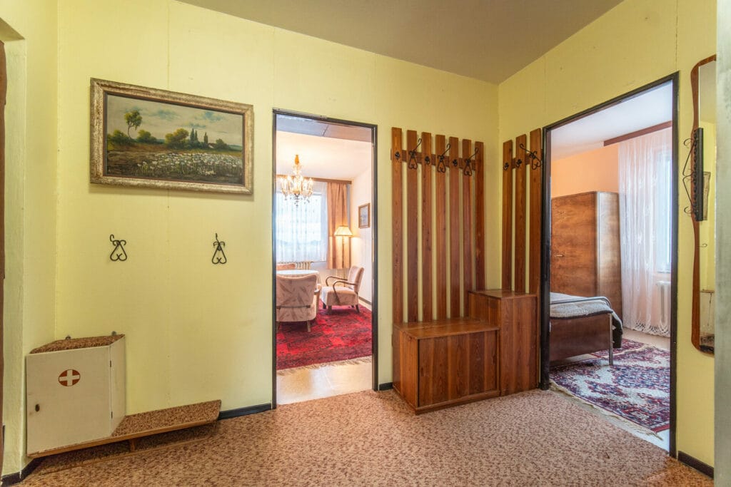 Byt je v původním ale udržovaném stavu, jádro je původní umakartové, elektřina v hliníku. Skromná kuchyňská linka obsahuje samostatně stojící plynový sporák s troubou, digestoř, dřez a lednici. V koupelně je umístěna vana a umyvadlo. Pokoje jsou vybaveny zachovalým nábytkem. K bytu dále náleží komora na patře (2 m2).