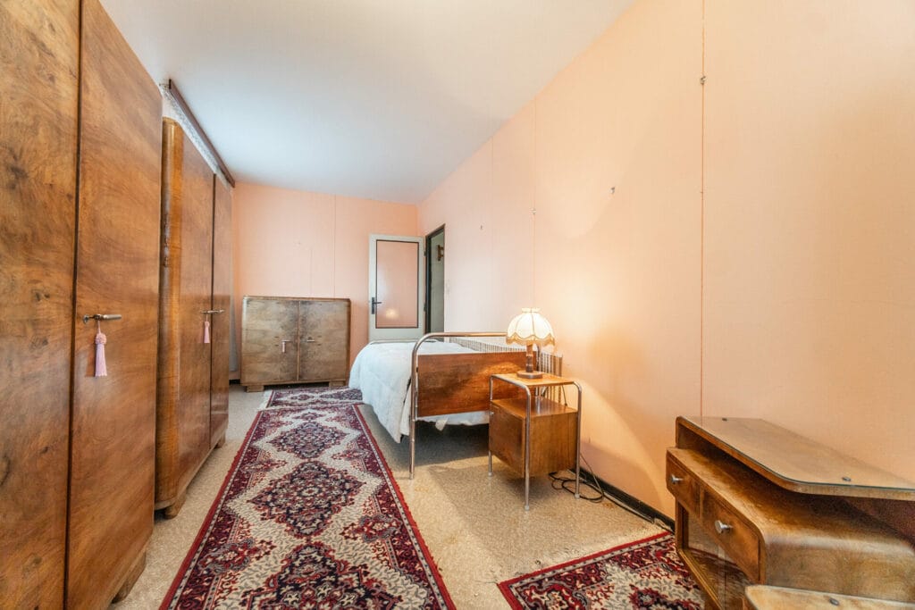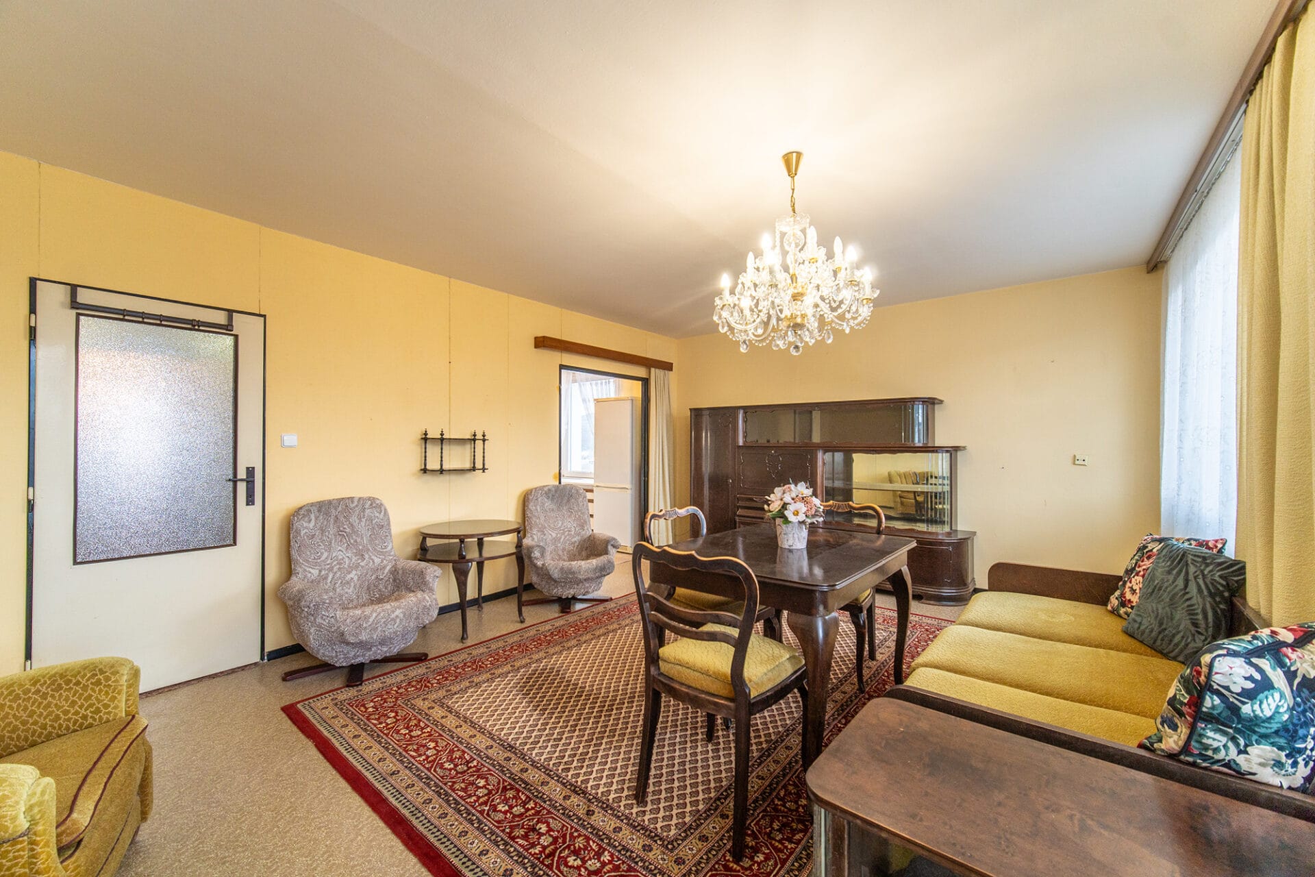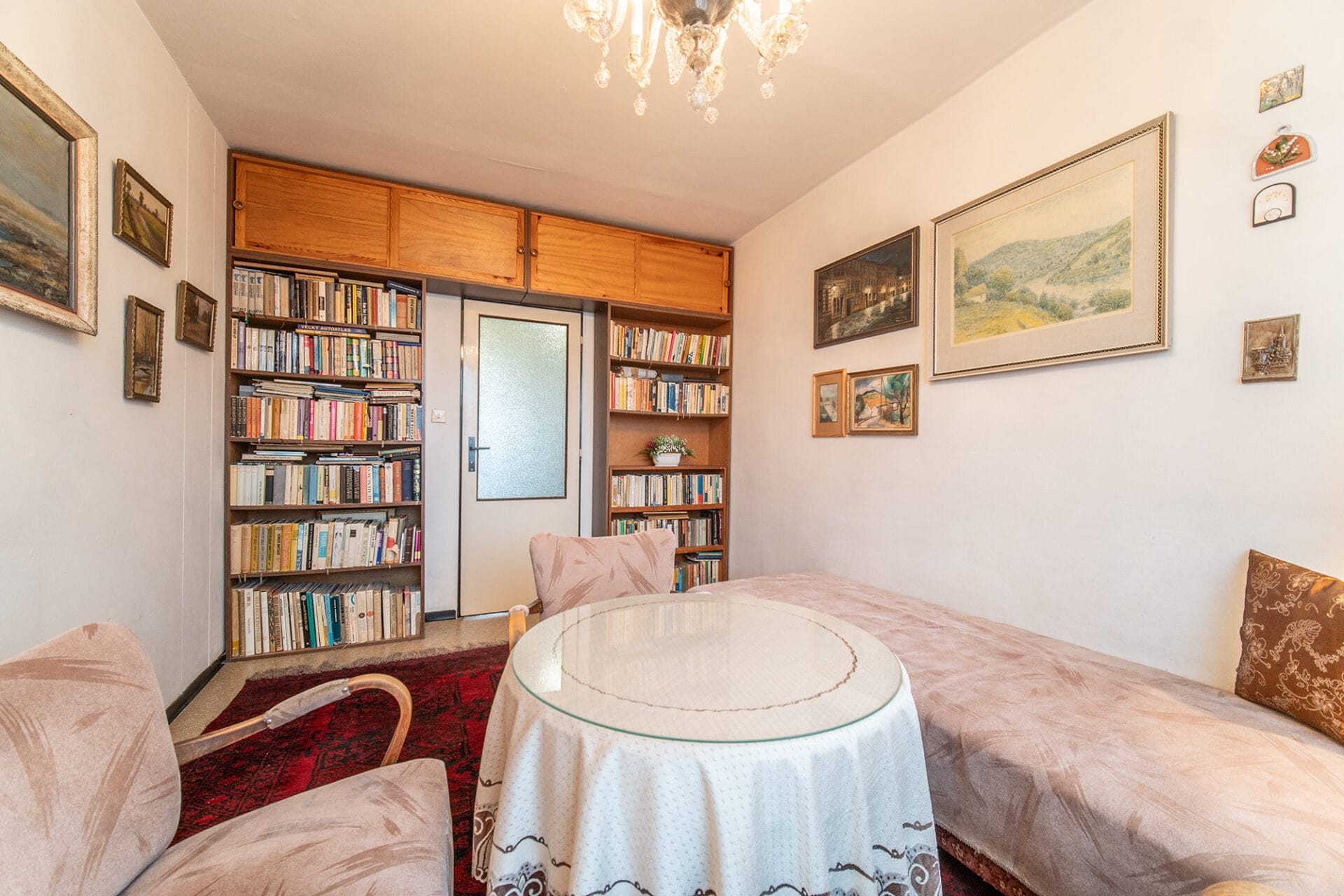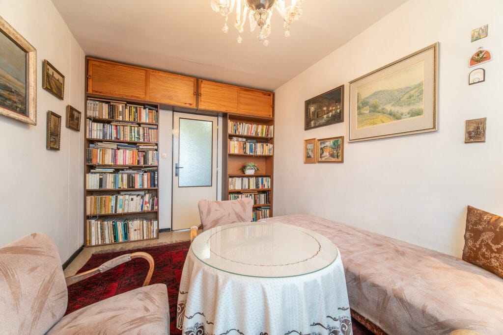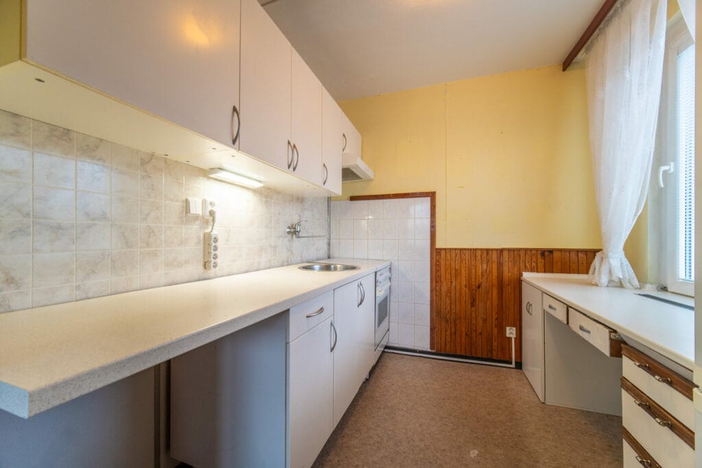 Byt je v původním ale udržovaném stavu, jádro je původní umakartové, elektřina v hliníku. Skromná kuchyňská linka obsahuje samostatně stojící plynový sporák s troubou, digestoř, dřez a lednici. V koupelně je umístěna vana a umyvadlo. Pokoje jsou vybaveny zachovalým nábytkem. K bytu dále náleží komora na patře (2 m2).