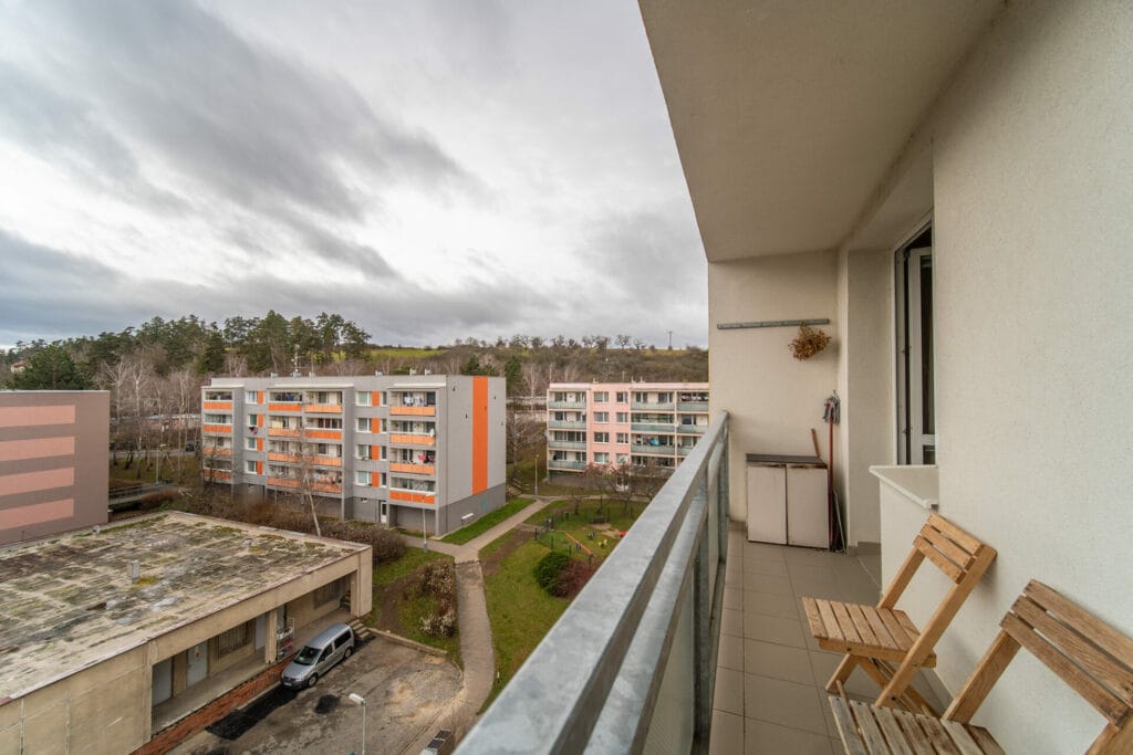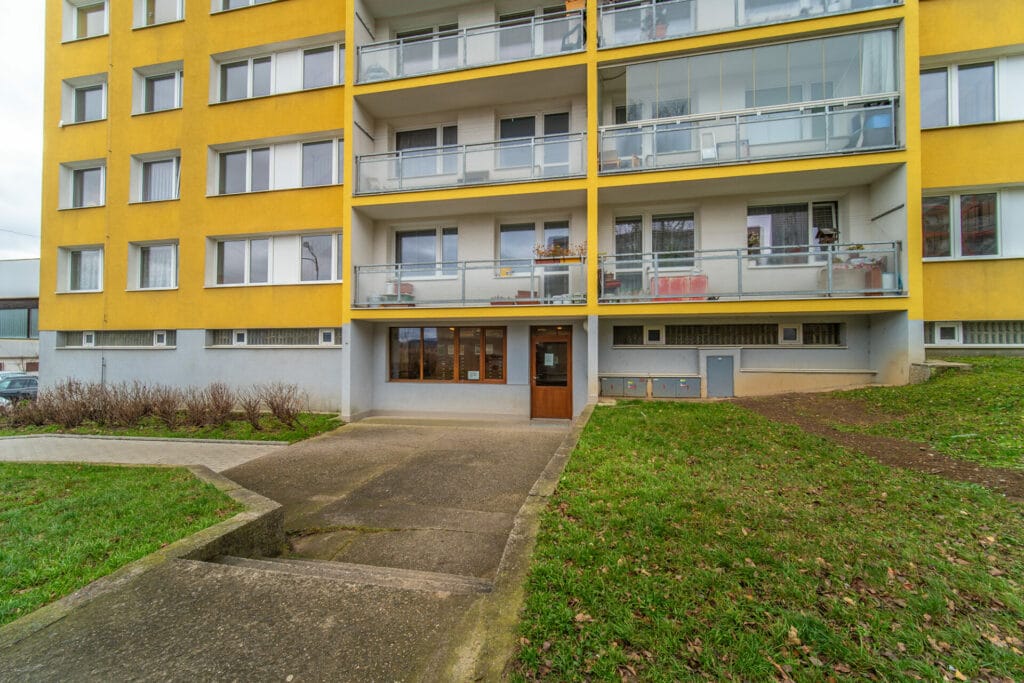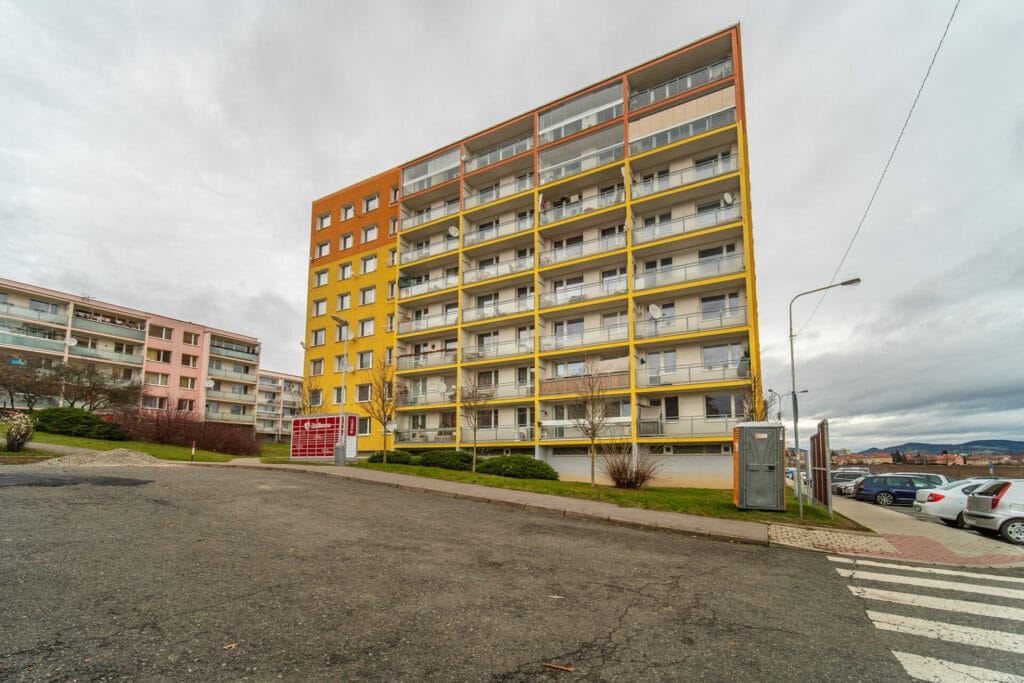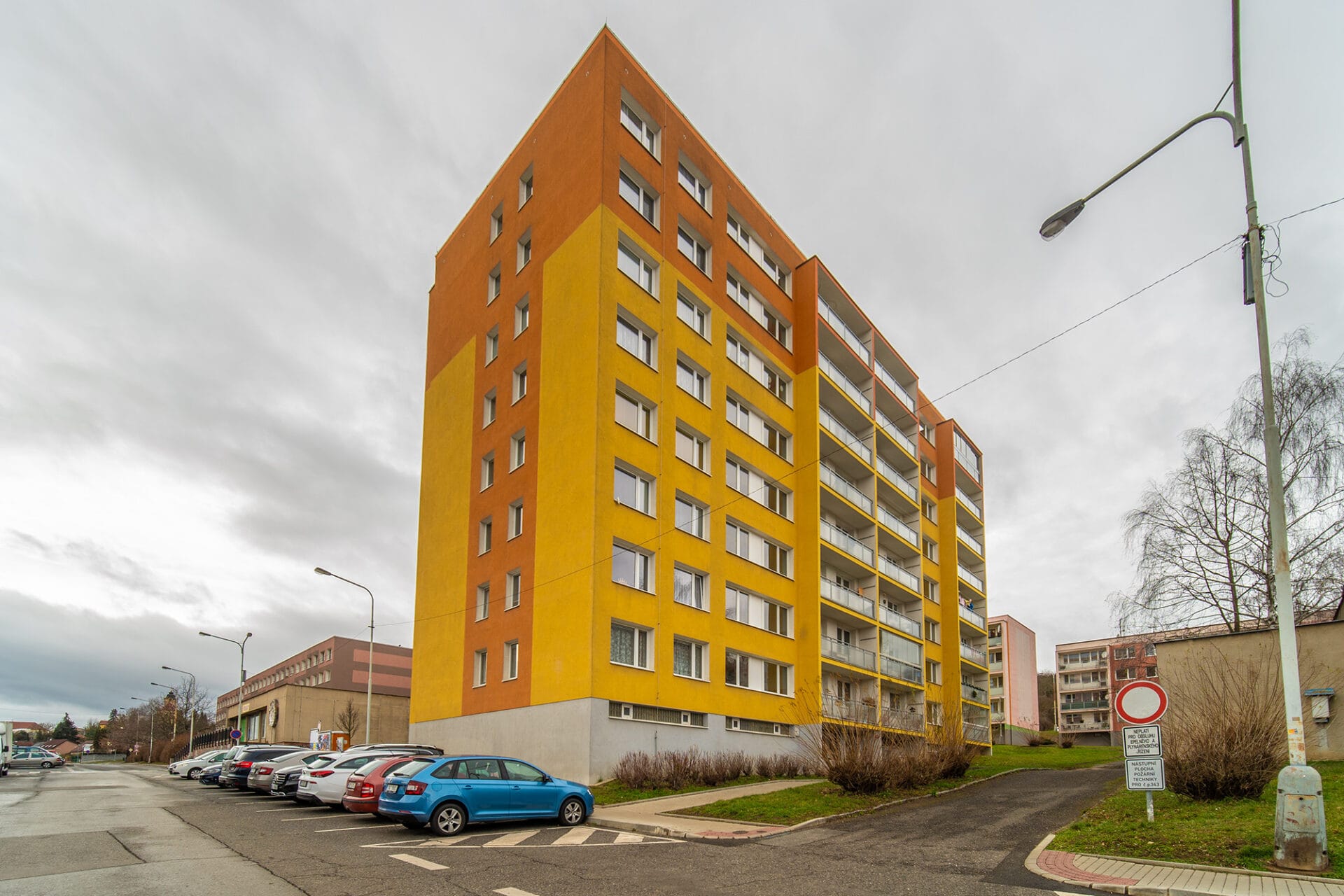 Devitipodlažní revitalizovaný panelový dům má plastová okna, zateplenou fasádu a nový výtah.