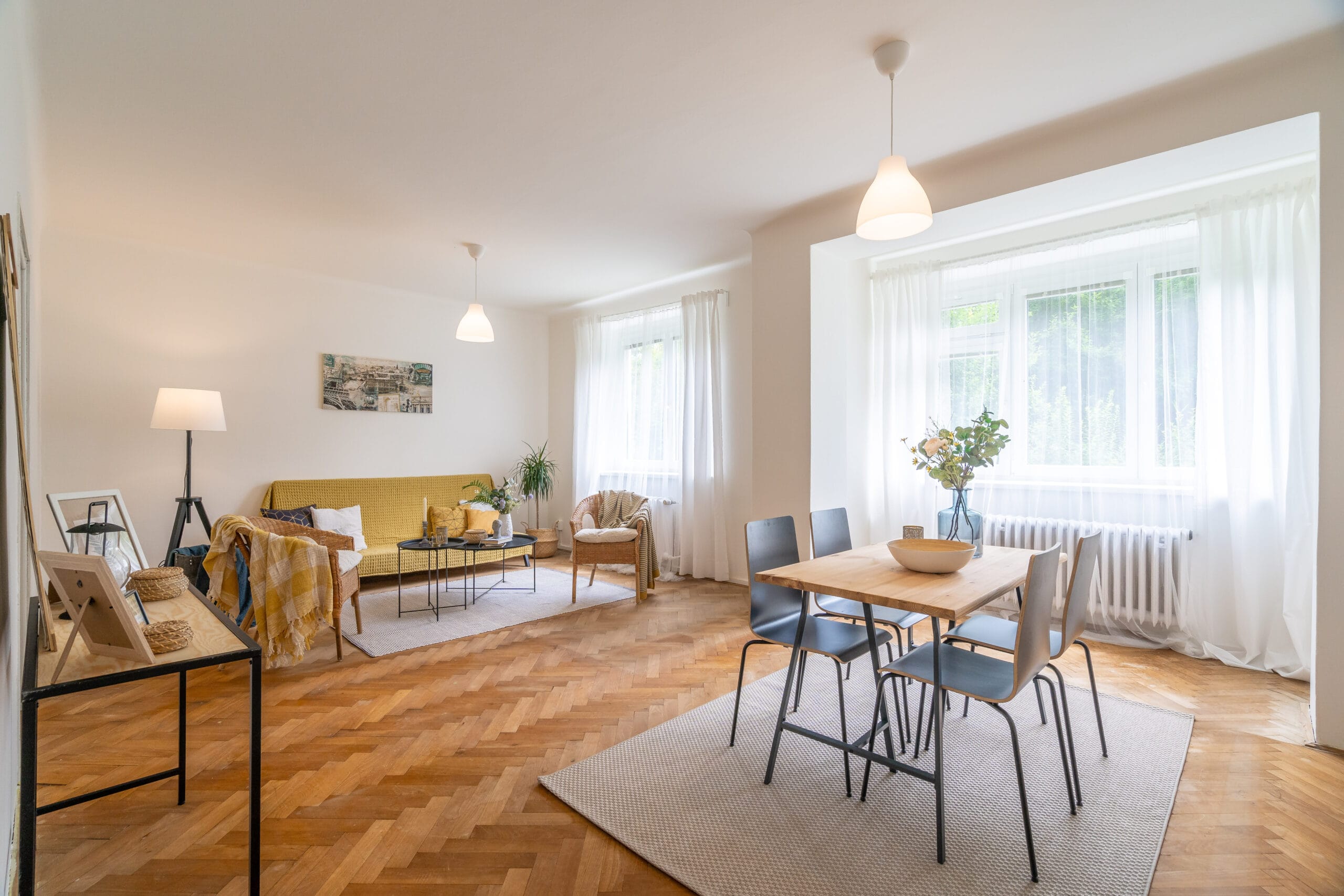 Byt je ve stavu před kompletní rekonstrukcí včetně rozvodů. Noví majitelé tak mají jedinečnou příležitost získat pomocí rekonstrukce moderní a prostorné bydlení v lukrativní části Prahy.