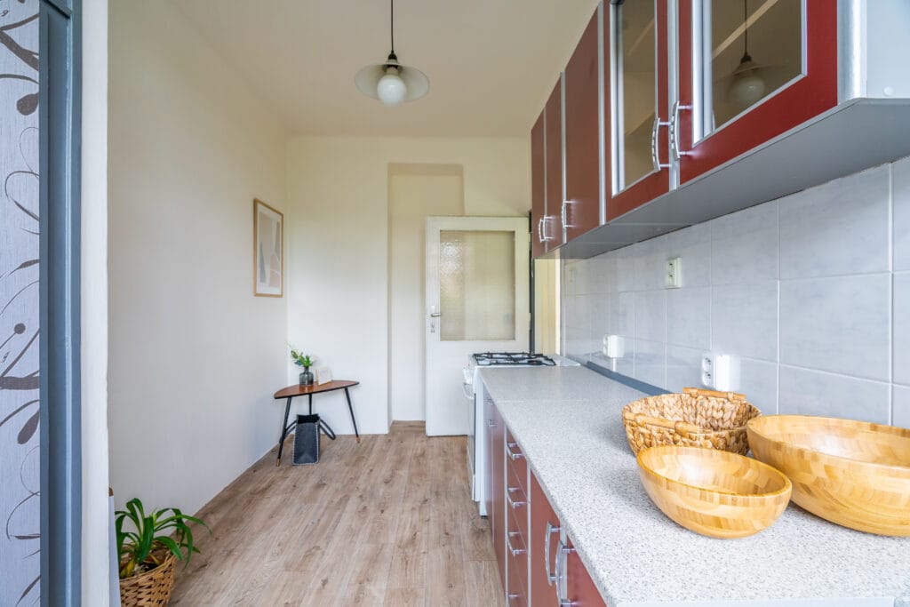 Byt je vybaven kuchyňskou linkou s plynovým sporákem a vestavěnou skříní na potraviny. Kuchyň, chodba a koupelna jsou opatřené linoleem, na toaletě je položená dlažba, v obývacím pokoji a ložnici parkety. Okna v bytě jsou plastová, v obývacím pokoji s žaluziemi. Ohřev teplé vody zajišťuje nový elektrický kotel umístěný v koupelně. K bytu náleží sklep (4 m2).