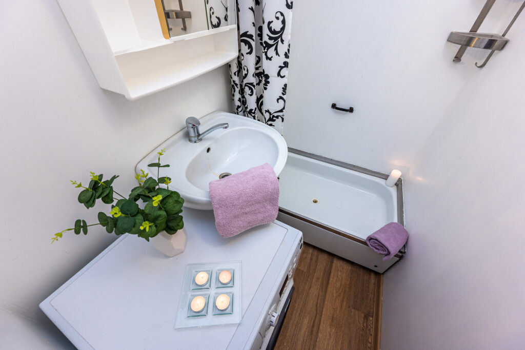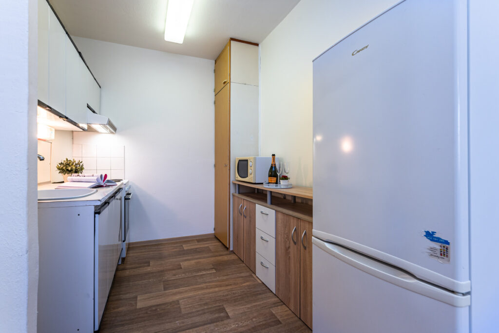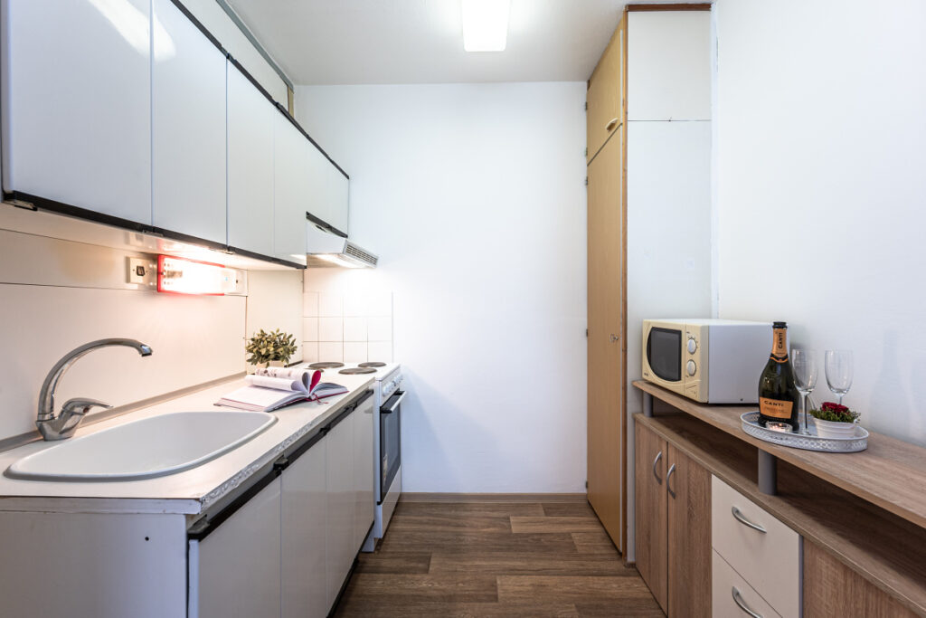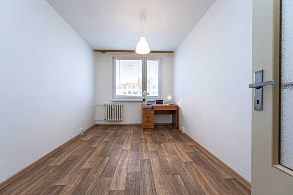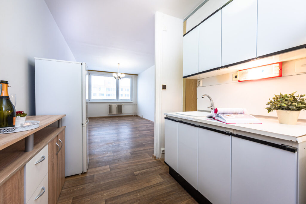 Byt je částečně vybavený – původní kuchyňská linka s dřezem, elektrickým sporákem, troubou a digestoří, vestavěná potravinová skříň, komoda, mikrovlnná trouba, automatická pračka, pracovní stůl a šatní skříně na chodbě.