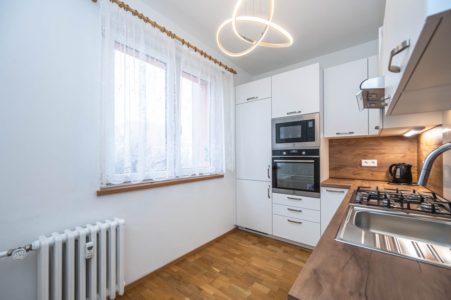 Interiér prošel částečnou rekonstrukcí a působí velmi příjemným a svěžím dojmem. Na podlaze je plovoucí podlaha s dekorem dřeva, v koupelně a na wc dlažba, v pokojích parkety. Plastová okna se žaluziemi propouštějí dostatek denního světla a dotvářejí příjemnou atmosféru po celý den. Kuchyňská linka je zcela nová a vybavená plynovou varnou deskou, elektrickou troubou, mikrovlnnou troubou, digestoří, myčkou a lednicí s mrazákem.