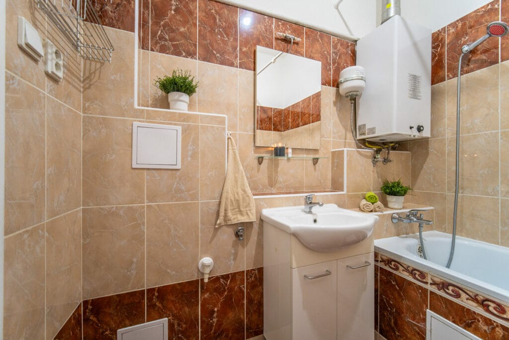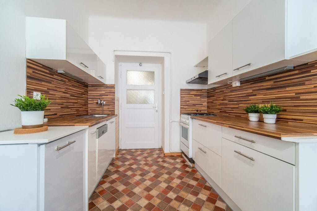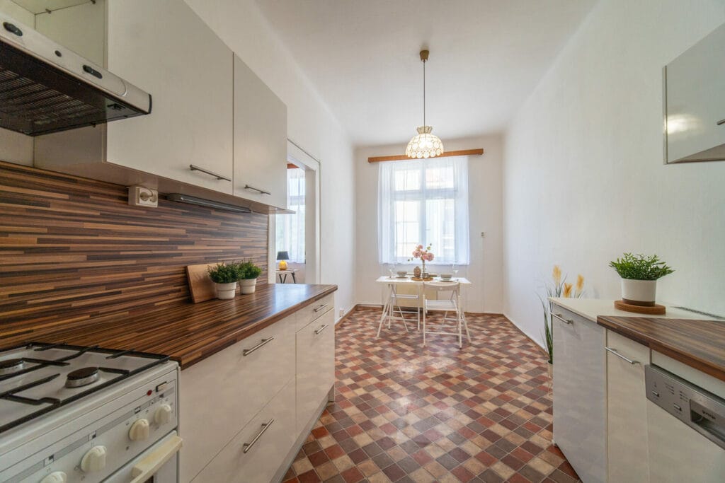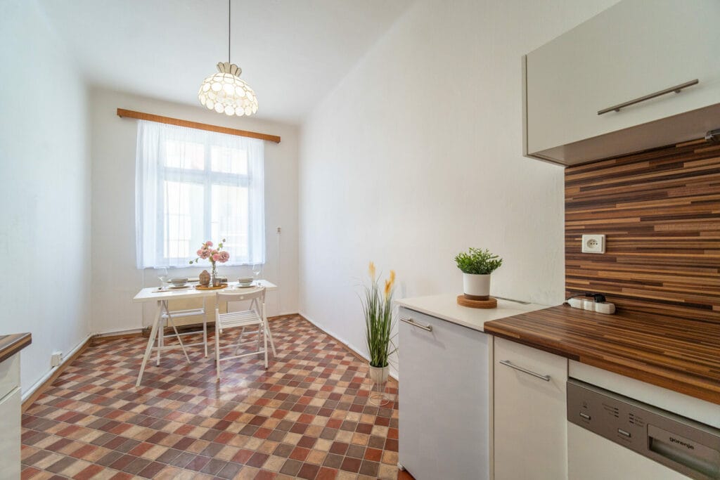 Byt je v dobrém stavu, vyklizený a připravený pro nového majitele. V kuchyni je kuchyňská linka s plynovým sporákem, myčkou a lednicí. Podlahu v v obývacím pokoji pokrývají parkety. V kuchyni, na chodbě a v komoře je linoleum, v koupelně a na wc je položená dlažba. Vytápění bytu zajišťují vafky umístěné v kuchyni. Okna orientovaná na JZ jsou dřevěná a opatřena vnitřními žaluziemi.