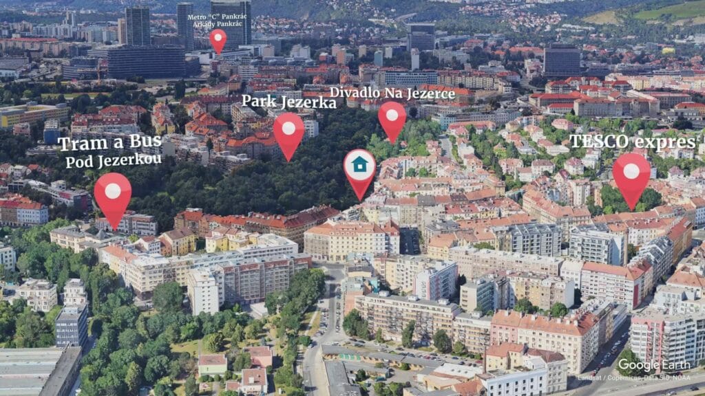 Byt se nachází v žádané lokalitě Prahy 4 — v Nuslích, přímo v klidné ulici Jaurisova. Hned naproti parku Jezerka, který je oblíbeným odpočinkovým místem s altánem, dětským hřištěm, divadlem i místem pro procházky. Dominantou parku je mohutný stoletý platan, který poskytuje příjemné ochlazení během teplých letních dní.