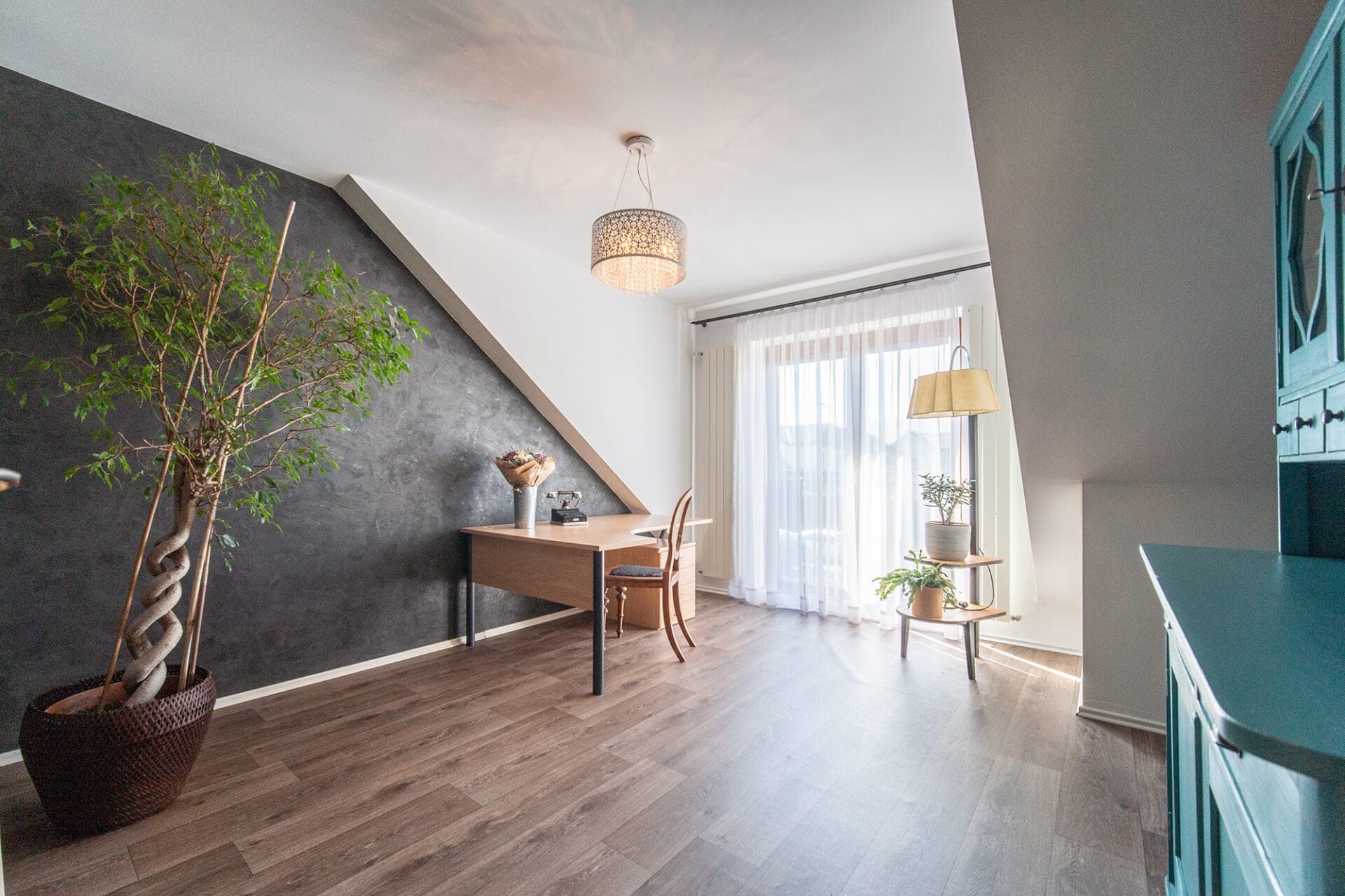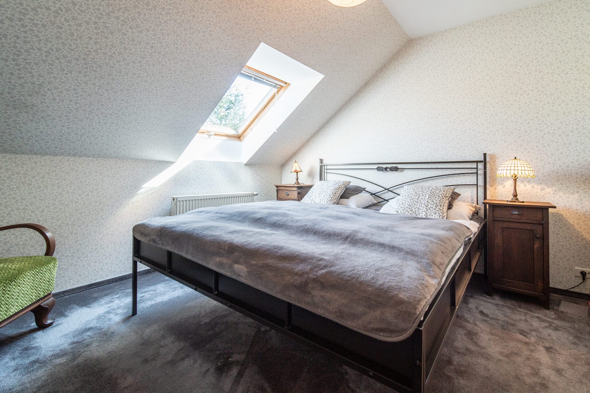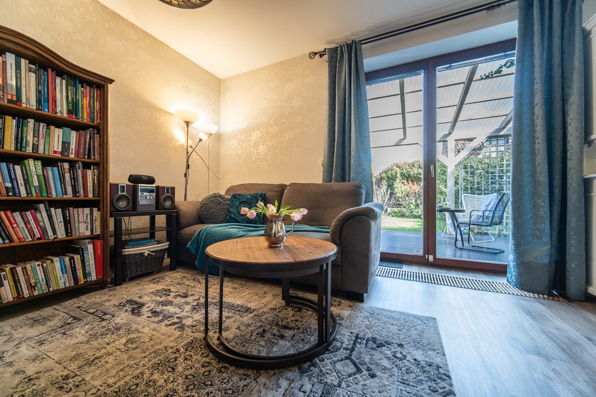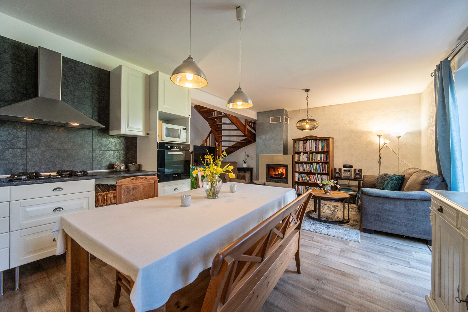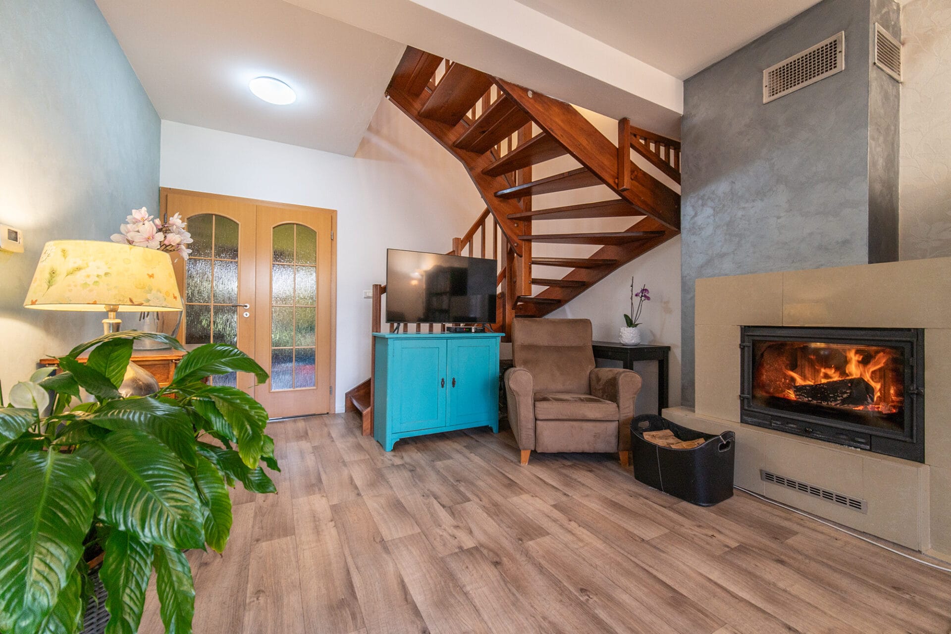 Krb v obývacím pokoji, dřevěné schodiště, francouzská okna