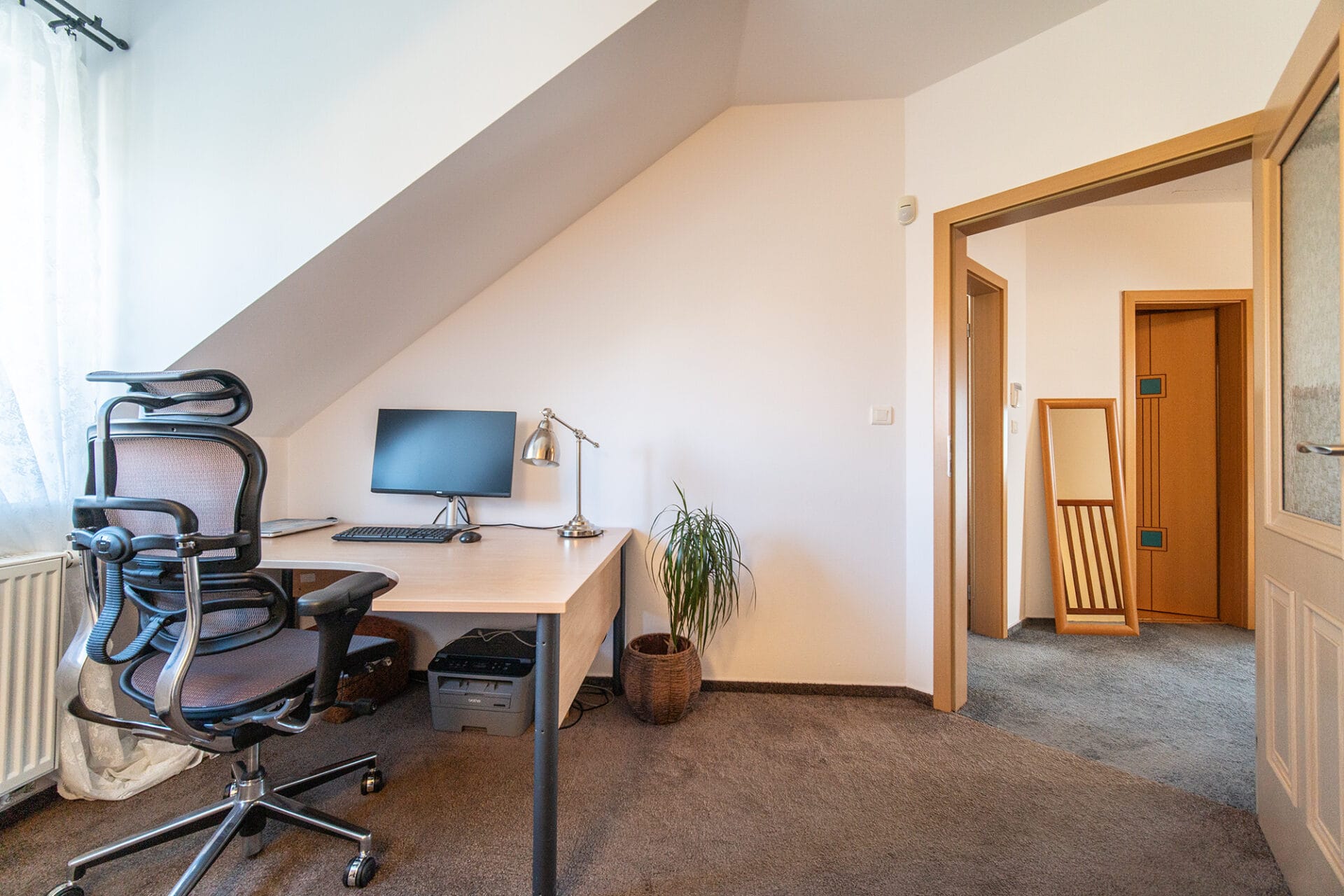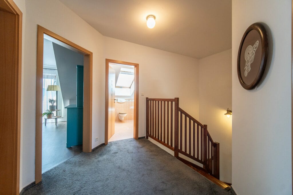V 1. podlaží se nachází předsíň, koupelna se sprchovým koutem a WC, kuchyňský kout spojený s obývacím pokojem, vstup na zastřešenou terasu a zahradu. Ve 2. podlaží najdete 3 samostatné pokoje, šatnu, koupelnu s rohovou vanou a WC.
