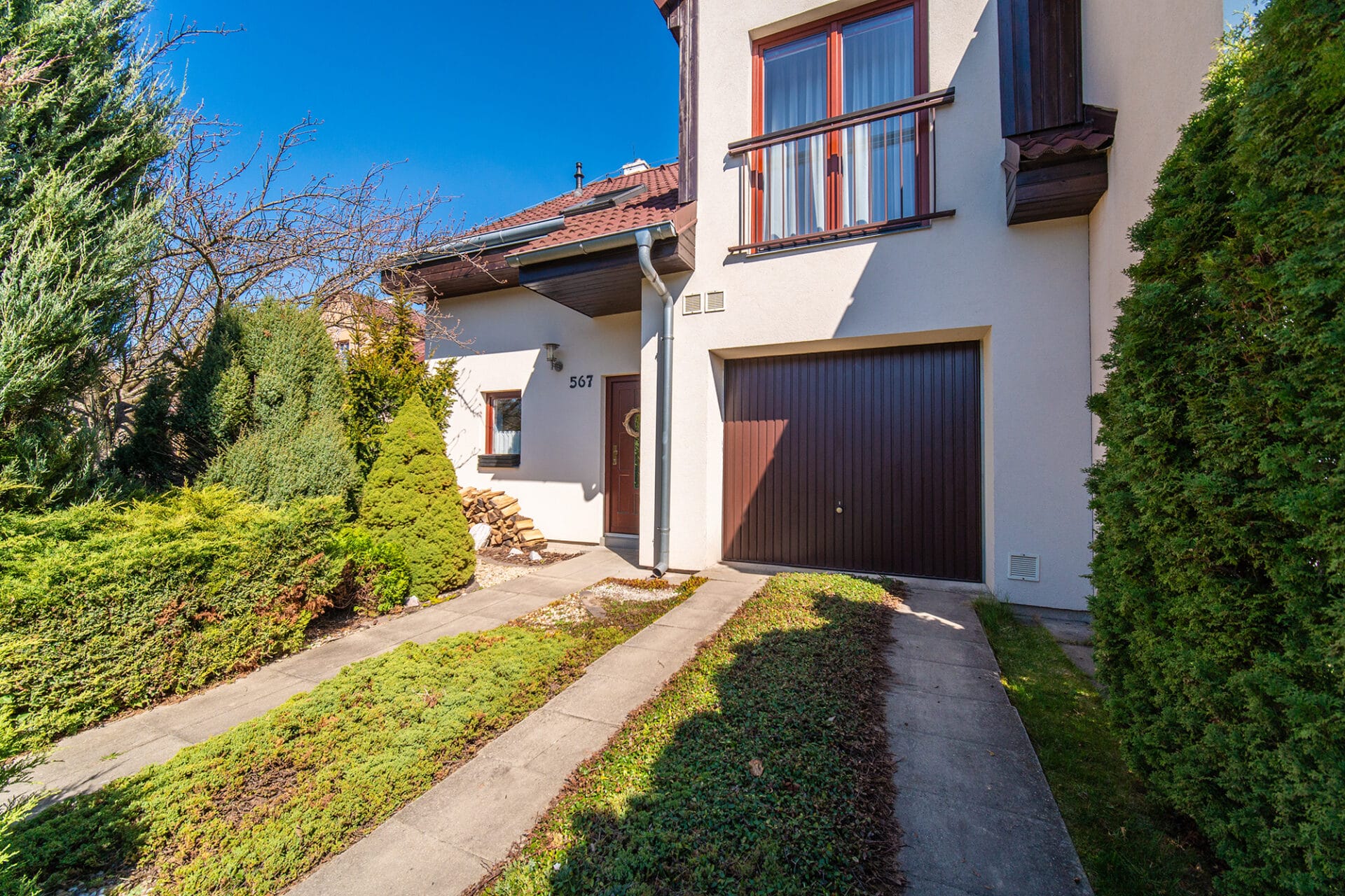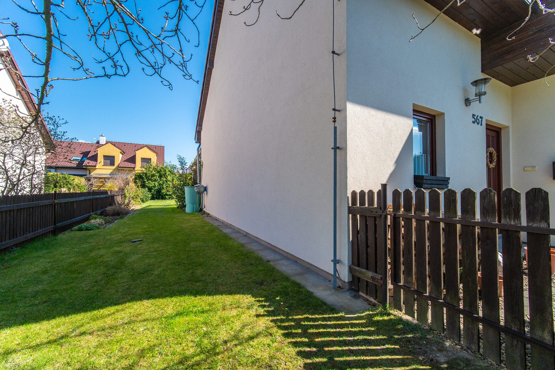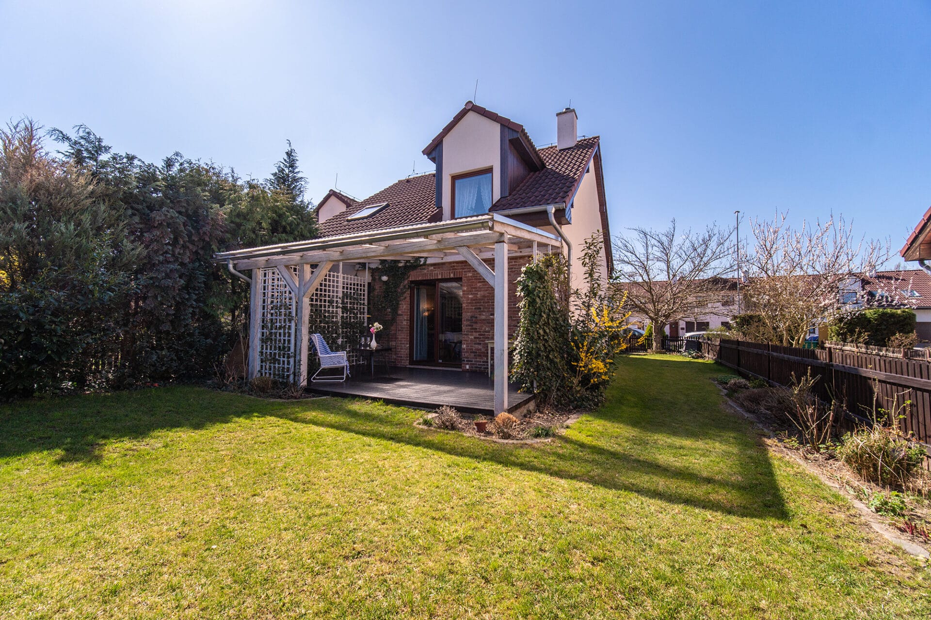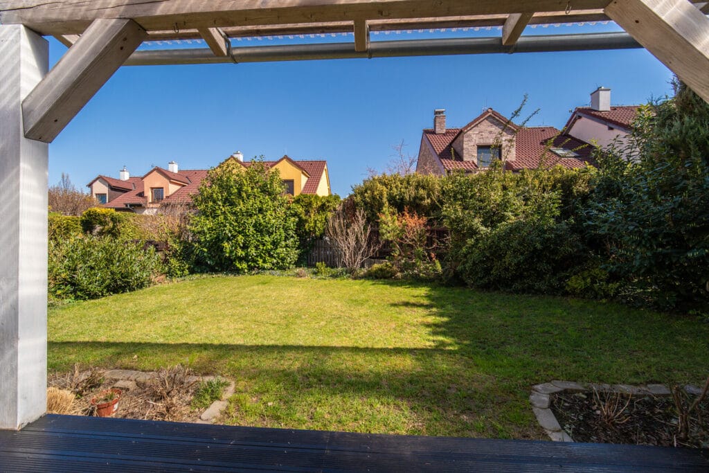 Celková výměra pozemku je 318 m². Okrasná zahrada poskytuje dostatek soukromí i prostoru pro relaxaci. Zastřešená terasa orientovaná na východ je ideálním místem pro společné rodinné snídaně, odpolední posezení, dětské hry i letní grilování – zkrátka prostor, kde si každý člen rodiny najde to své.