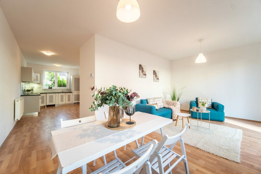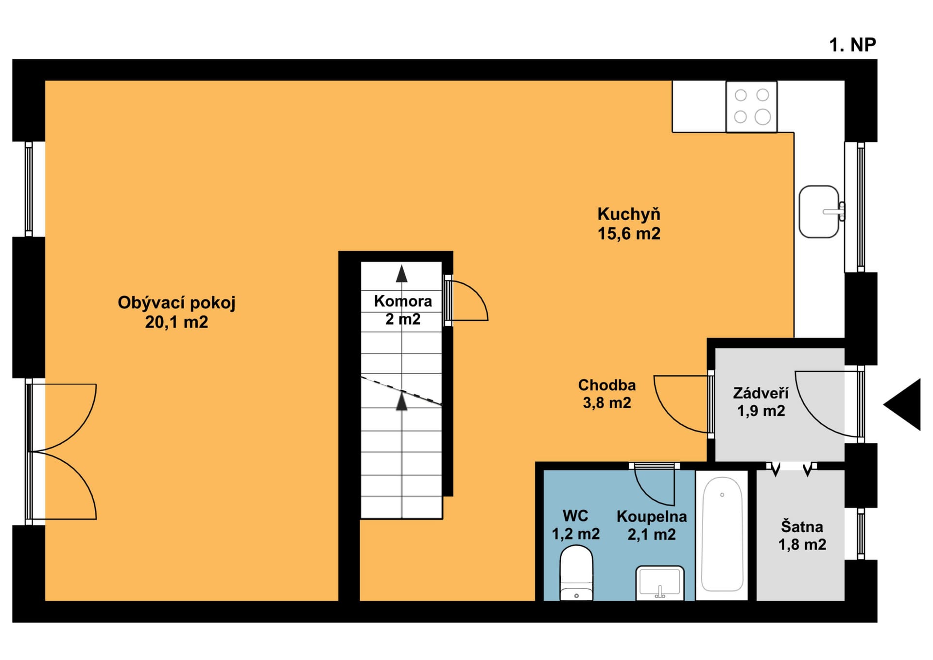 Díky promyšlené koncepci je dům příjemně dispozičně řešený a komfortní. V 1. podlaží je zádveří (1,9 m2), chodba (3,8 m2), kuchyně (15,6 m2), obývací pokoj (20,1 m2), šatna (1,8 m2), komora (2 m2), koupelna s wc (3,3 m2).