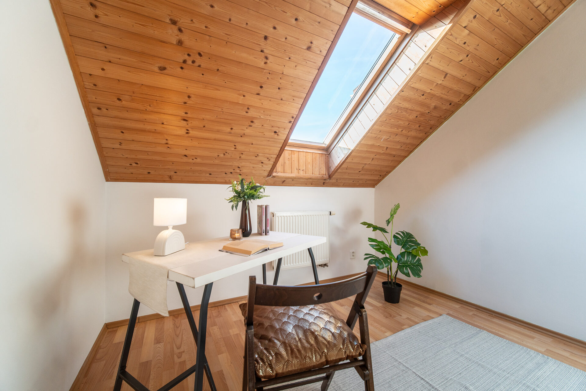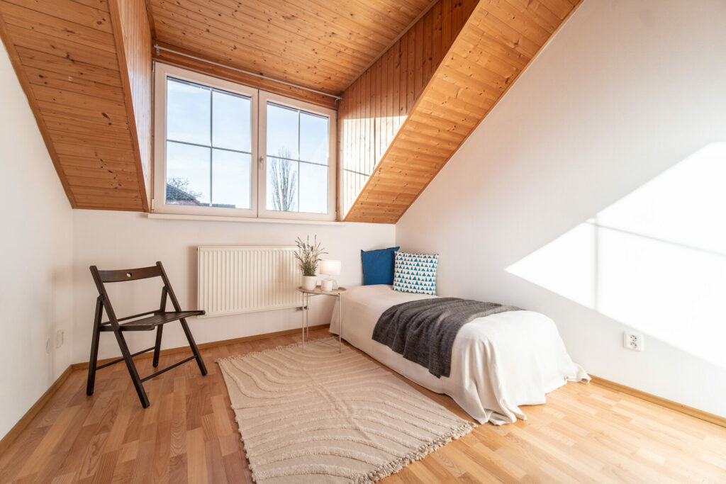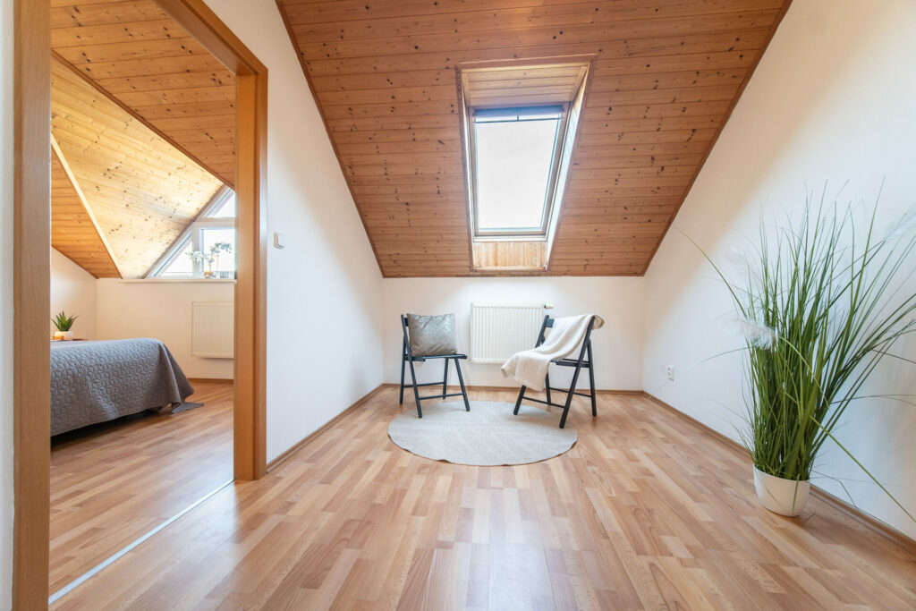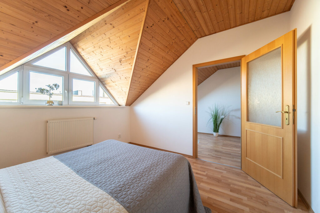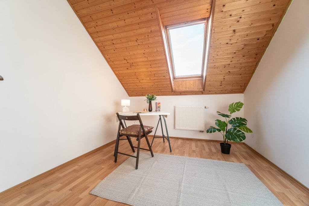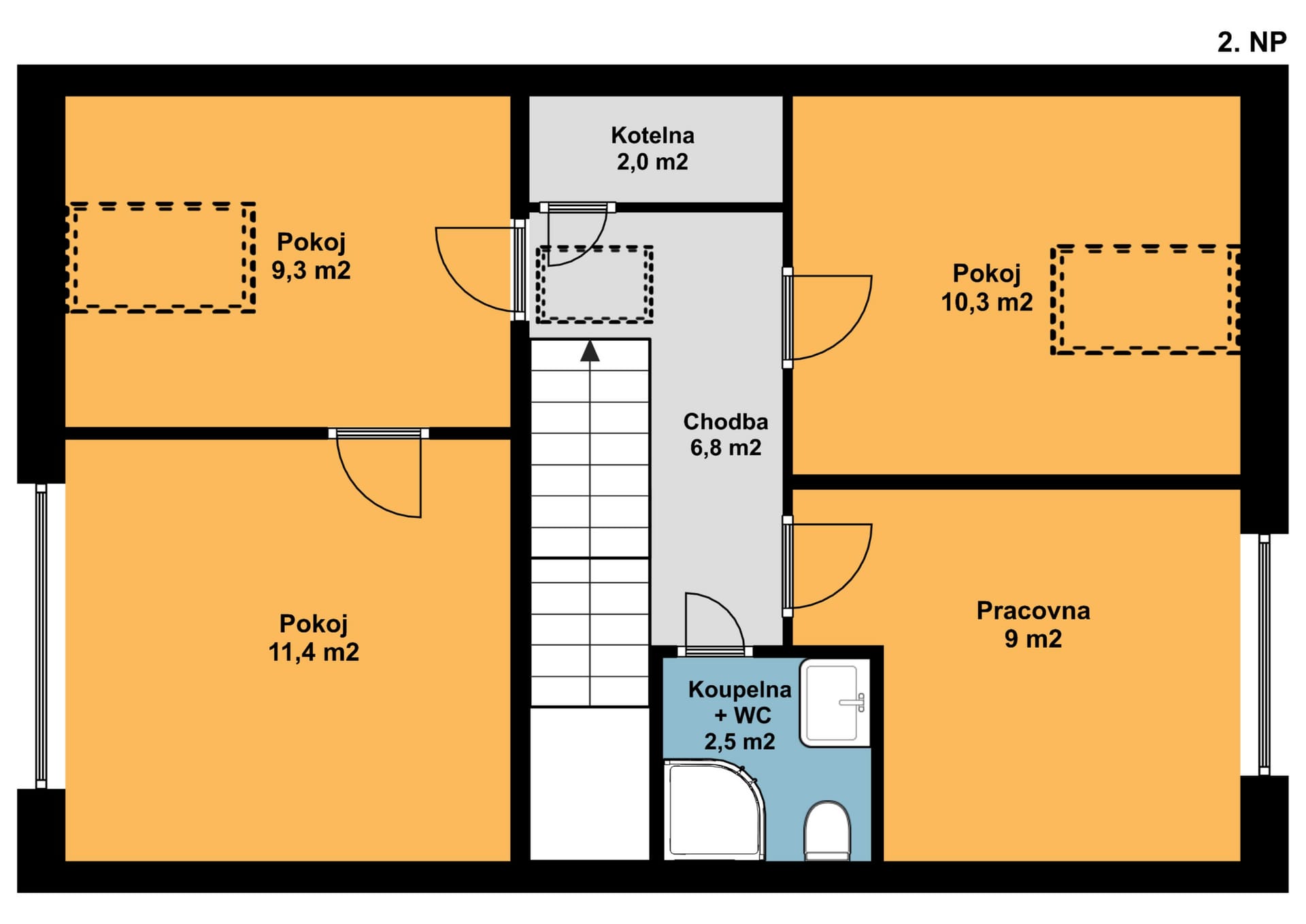 V 2. nadzemním podlaží je chodba (6,8 m2), kotelna (2 m2), pracovna (9 m2), pokoj (9,3 m2), pokoj (10,3 m2), pokoj (11,4 m2), koupelna s wc (2,5 m2).