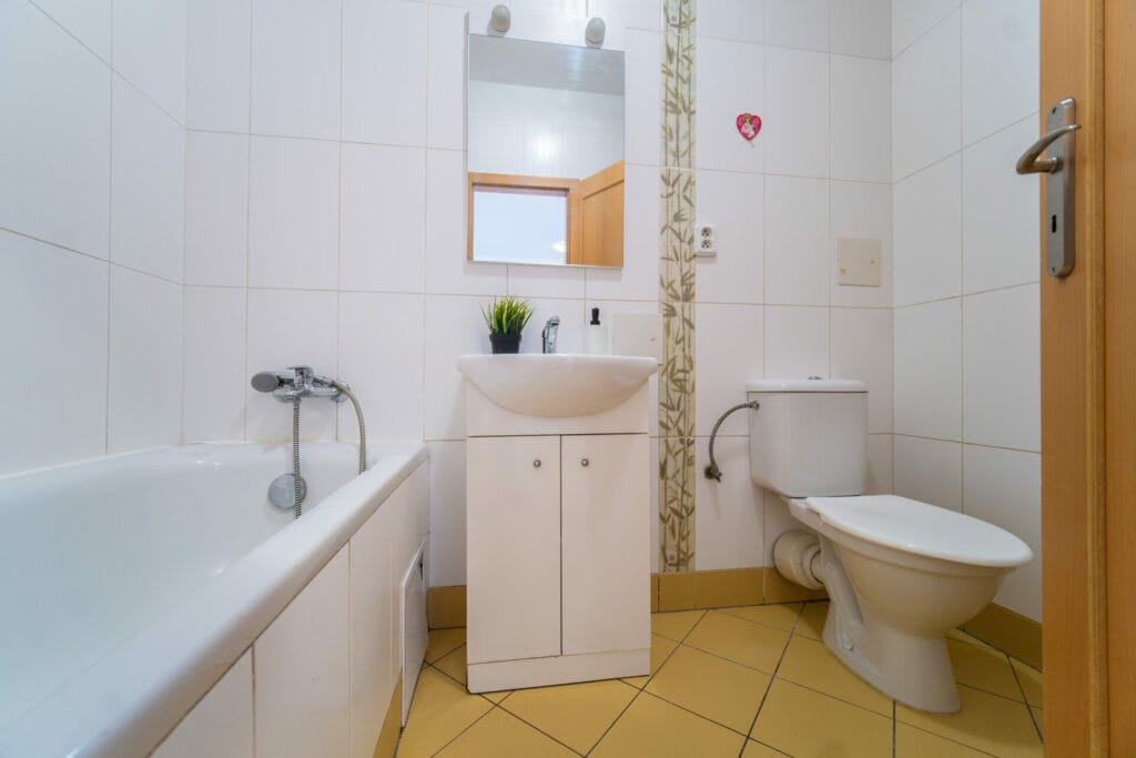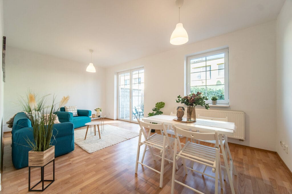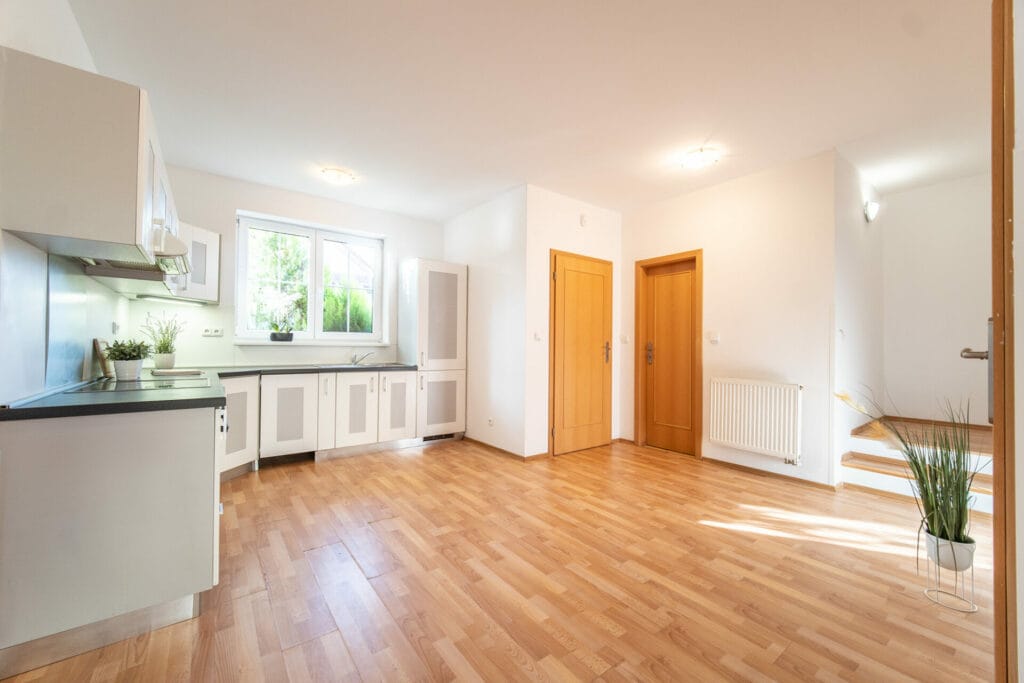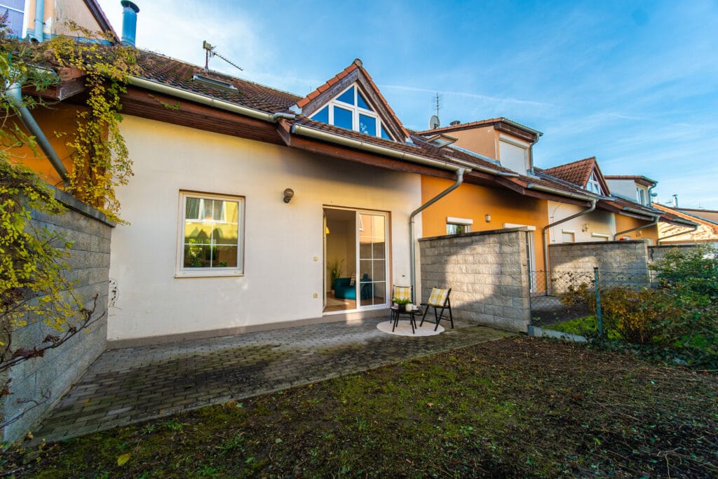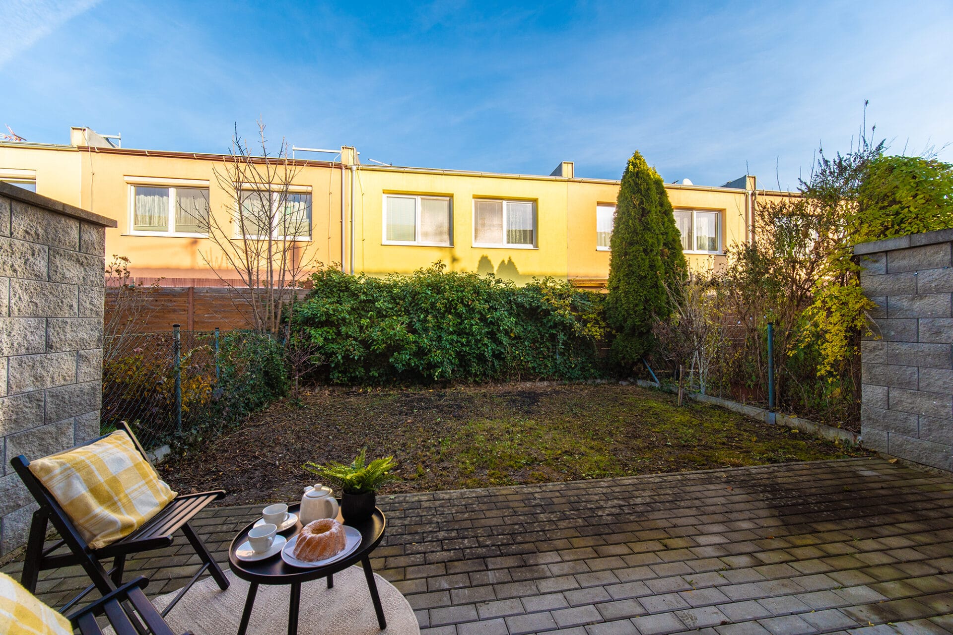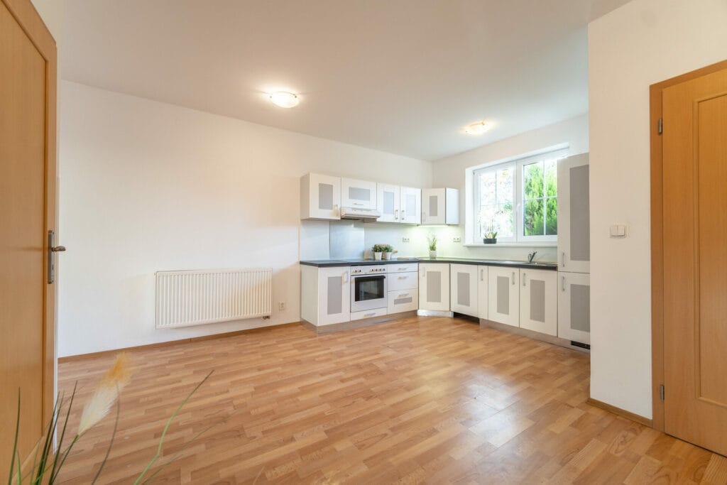 V koupelně je vana s umyvadlem a toaletou. V kuchyni je moderní a nadčasová rohová kuchyňská linka bílé barvy vybavená sklokeramickou varnou deskou, el. troubou a digestoří. V obývacím pokoji jsou francouzská okna se vstupem na terasu a zahrádku.