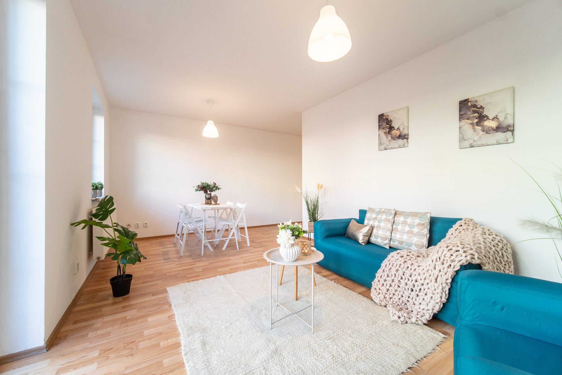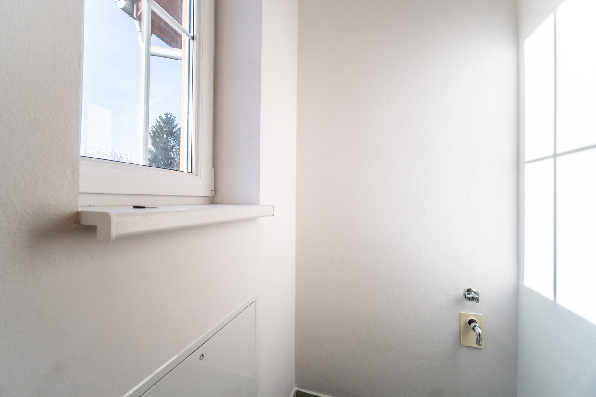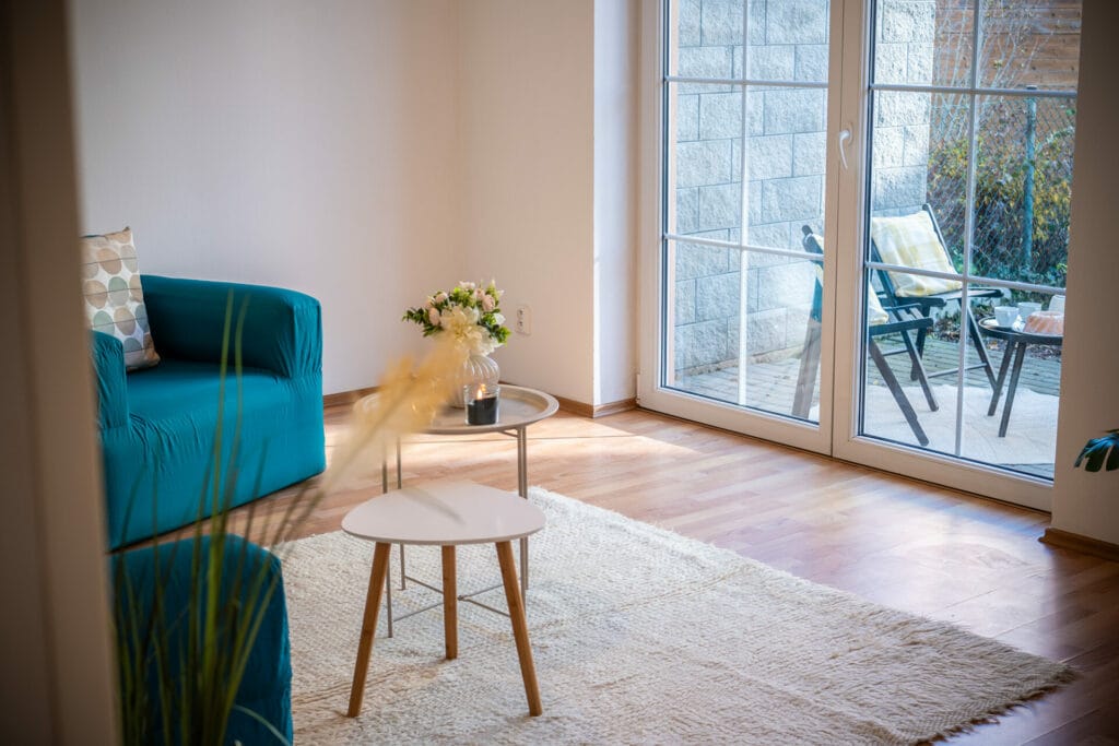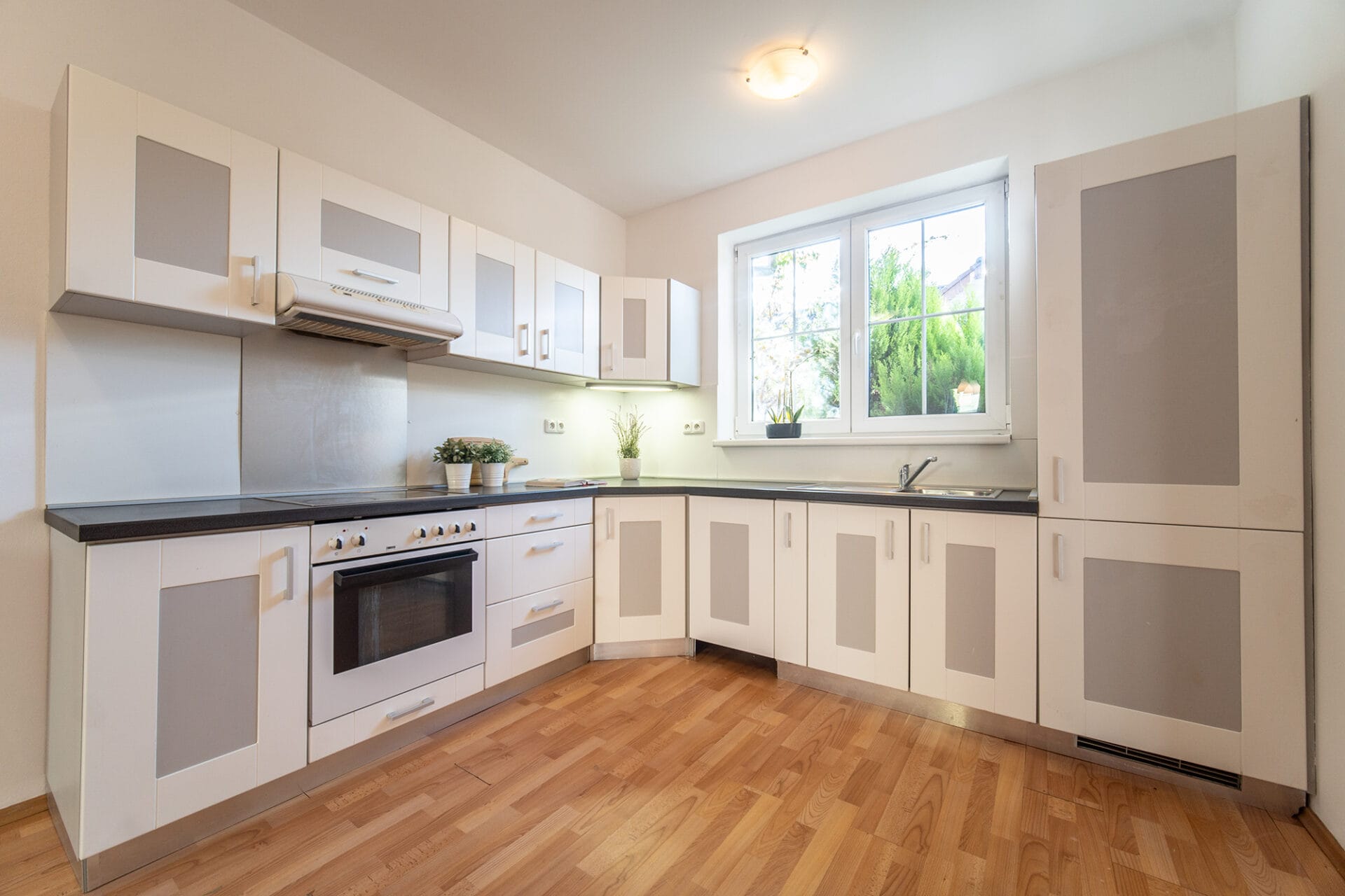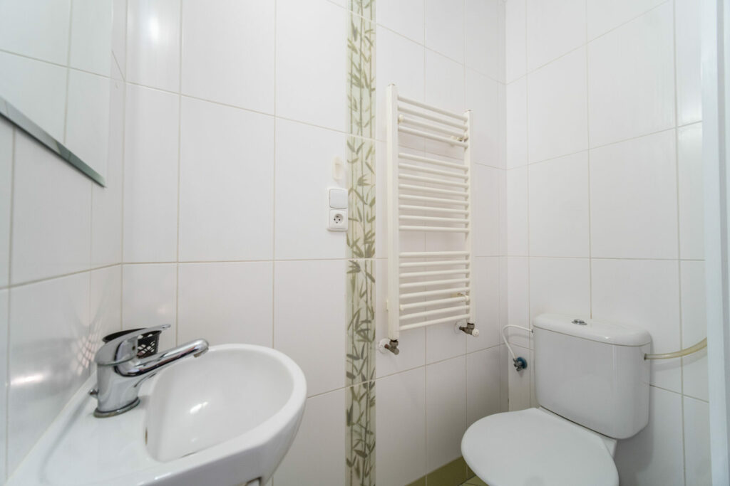 V koupelně je vana s umyvadlem a toaletou. V kuchyni je moderní a nadčasová rohová kuchyňská linka bílé barvy vybavená sklokeramickou varnou deskou, el. troubou a digestoří. V obývacím pokoji jsou francouzská okna se vstupem na terasu a zahrádku.