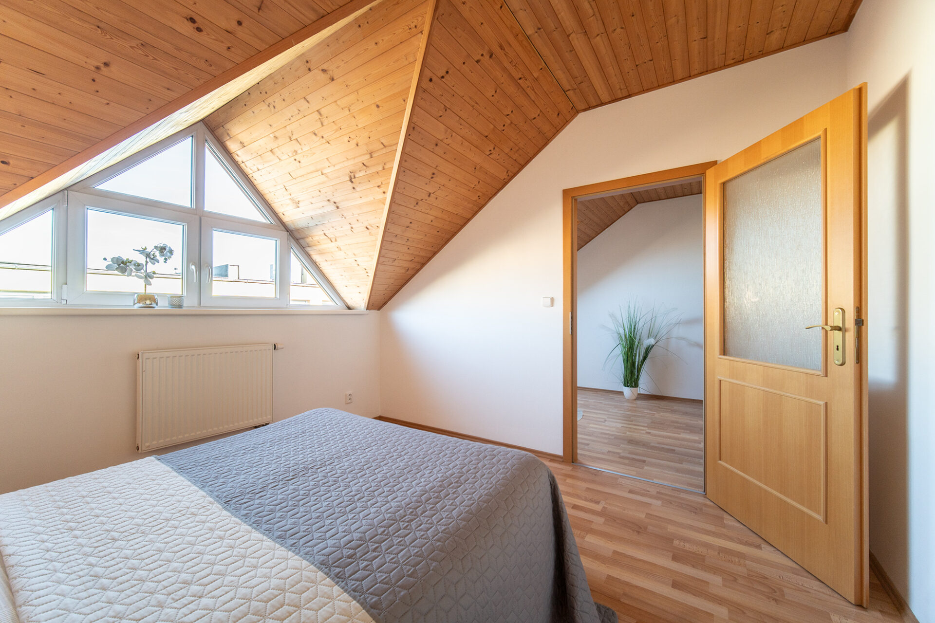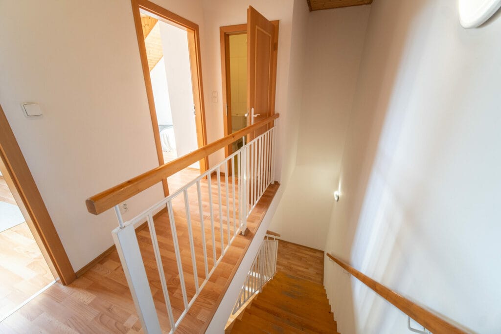Patra jsou propojena schodištěm s dřevěným obložením.