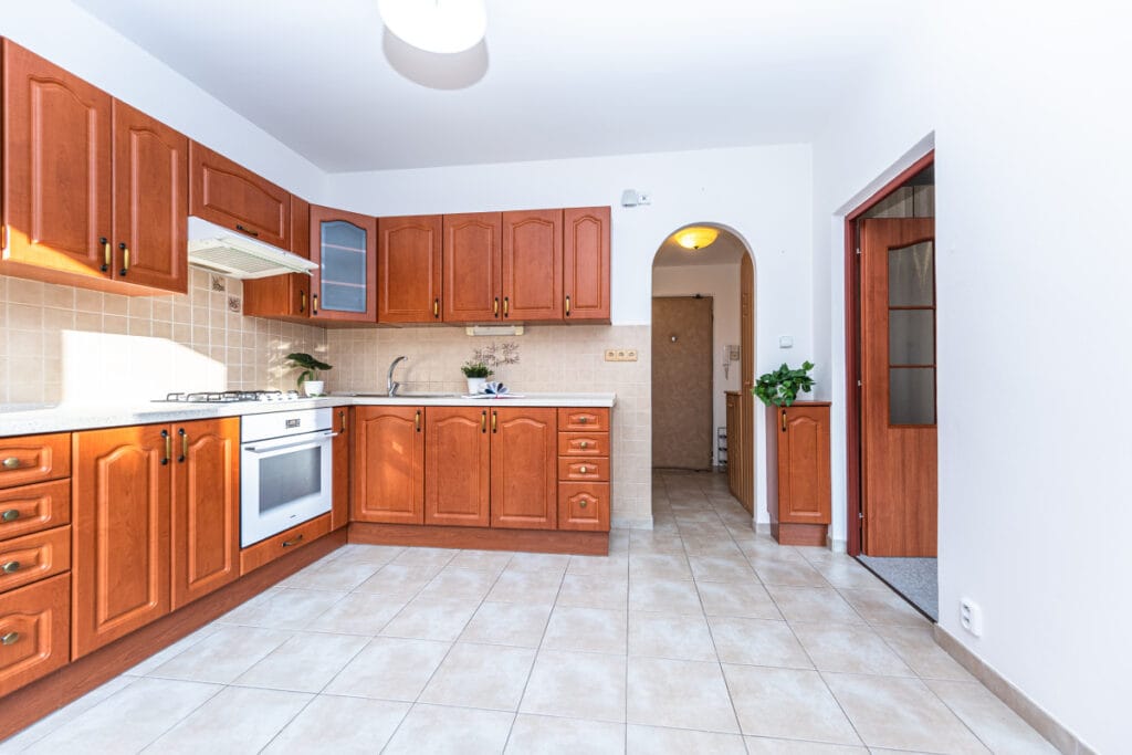 Kuchyně – prostorná kuchyňská linka s vestavěnými spotřebiči (plynová varná deska, elektrická trouba, digestoř, lednice s mrazákem, pračka). Místnost je dostatečně velká i pro jídelní stůl.