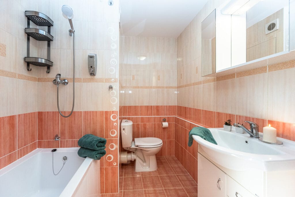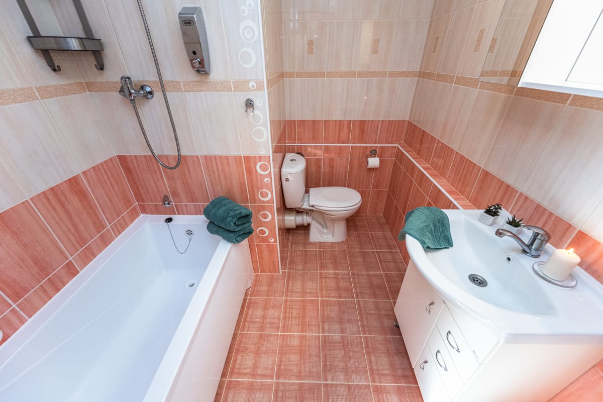 Koupelna – vana (1,2 m) se sprchou, umyvadlo se skříňkou, zrcadlová skříňka a WC.