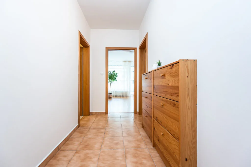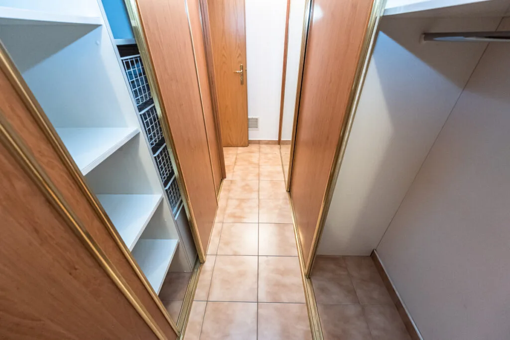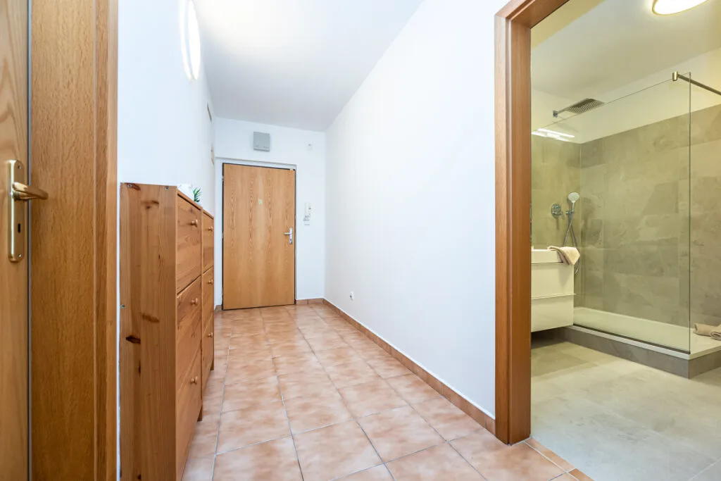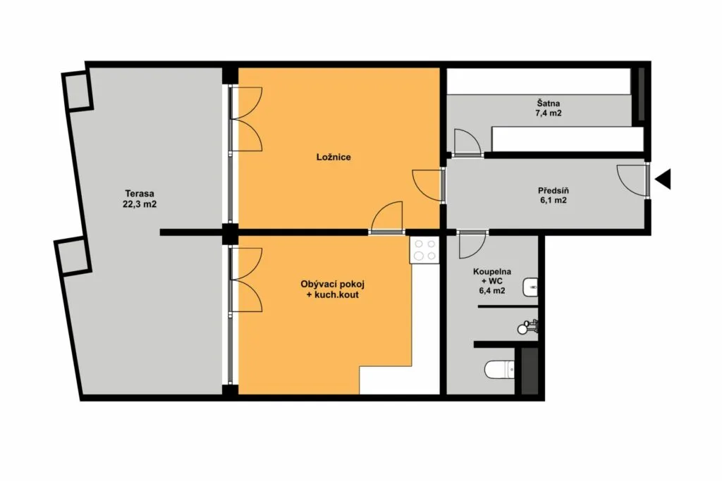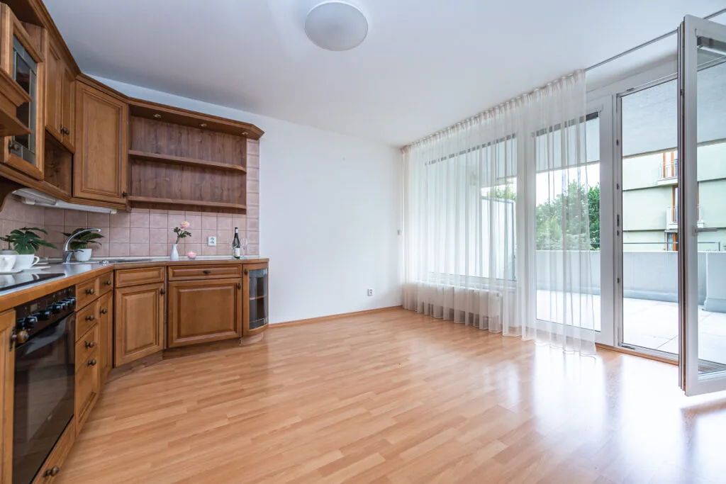 Dispozice bytu: obývací pokoj s kuchyňským koutem a vstupem na terasu, průchozí ložnice se vstupem na terasu, vstupní chodba, šatna s vestavěnými skříněmi, zrekonstruovaná koupelna se sprchovým koutem, umyvadlem a wc.
