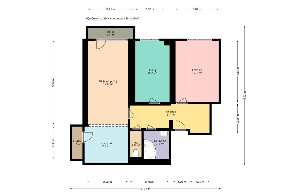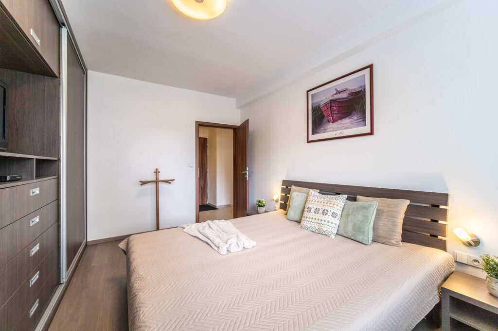 Byt tvoří předsíň, kuchyňský kout propojený s obývacím pokojem a dvěma balkóny 2,48 m² a 2,30 m², dvě ložnice, koupelna s vanou, samostatné WC. K bytu dále náleží sklepní kóje (2 m²) umístěná v 1. NP. V domě jsou k dispozici společné prostory – kolárna a sušárna.