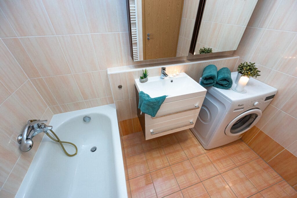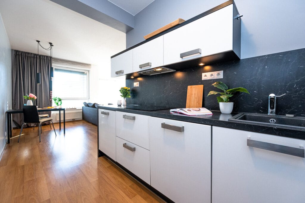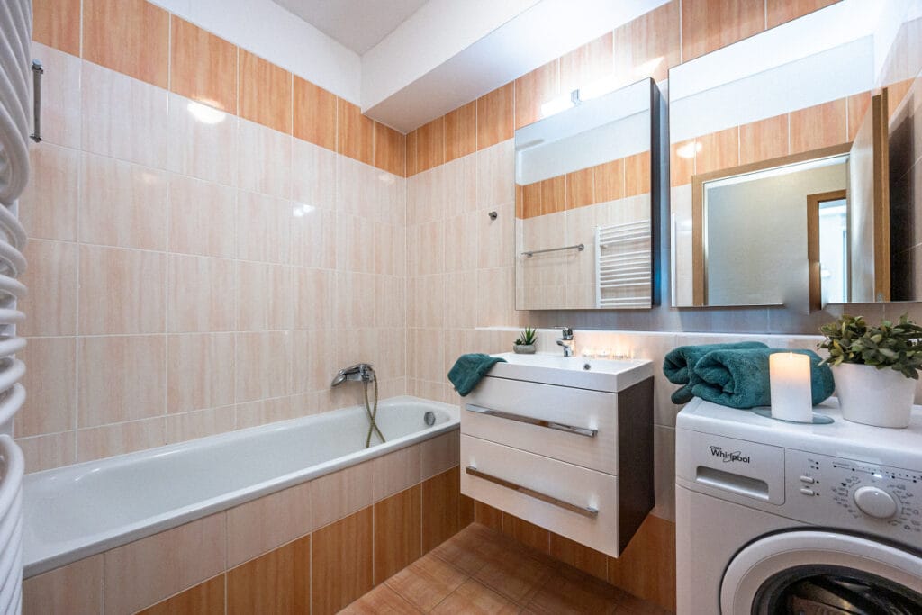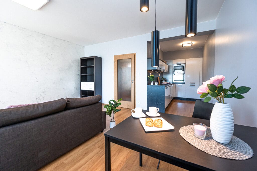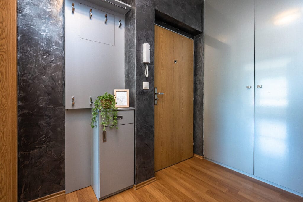 Je tvořen vstupní chodbou, komorou/šatnou, koupelnou, samostatným wc, dvěma ložnicemi a obývacím pokojem s kuchyňským koutem se vstupem na balkón. Velmi moderní a nadstandardní byt je vybaven kuchyňskou linku se spotřebiči (lednička s mrazákem, elektrická varná deska, trouba, digestoř, myčka a mikrovlnná trouba), jídelním stolem se dvěma židlemi, rozkládací pohovkou, vestavěnými skříněmi, volně stojícími skříněmi, věšákovou stěnou a botníkem . V prostorné koupelně je vana, umyvadlo s umyvadlovou skříňkou, pračka a topný žebřík.