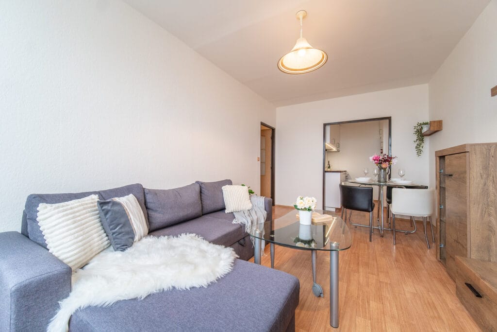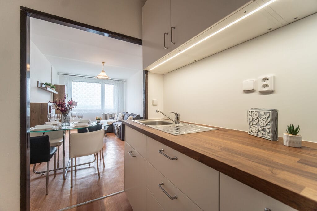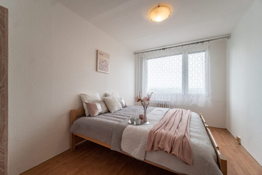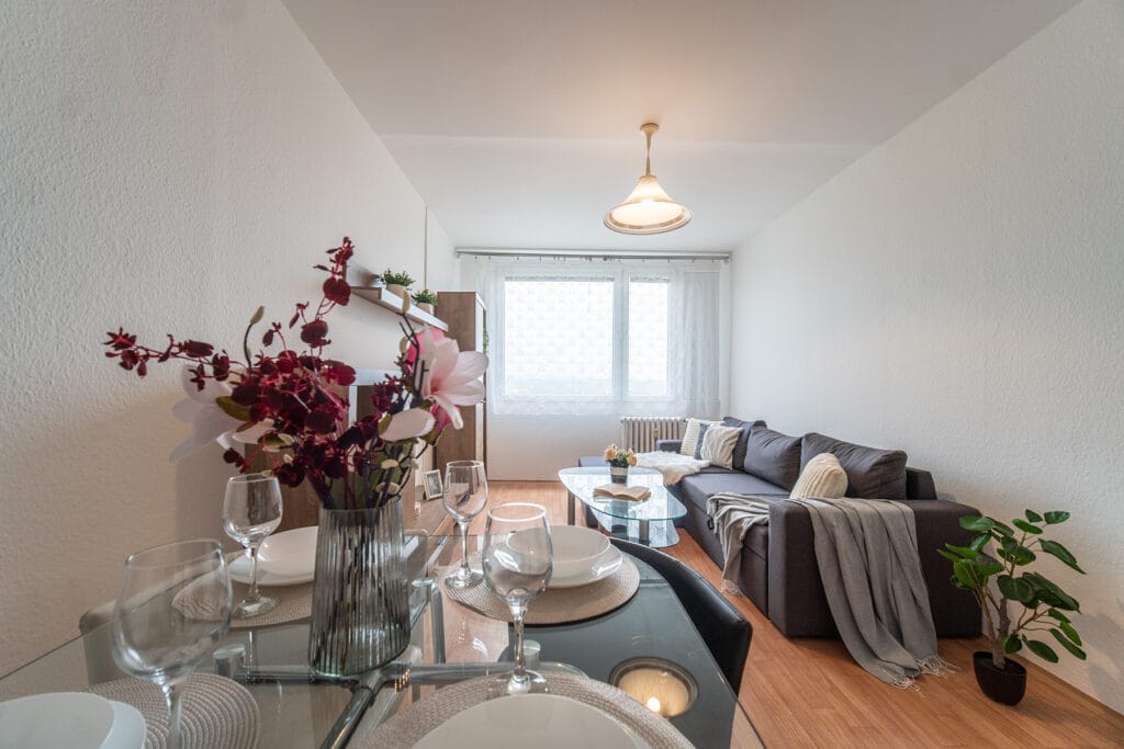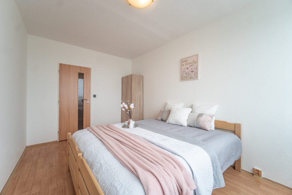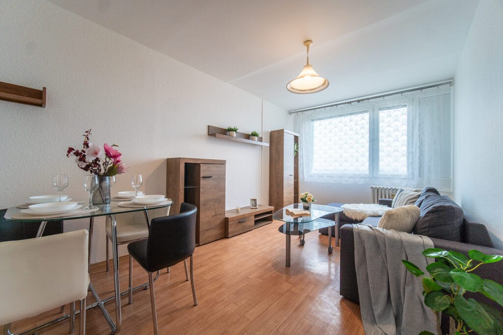 Byt se prodává vybavený. Kuchyňská linka obsahuje plynový sporák s elektrickou troubou, digestoř a ledničku s mrazákem. V obývacím pokoji je obývací stěna, rozkládací rohový gauč, konferenční stolek, jídelní stůl se 4 židlemi. Na chodbě je vestavěná šatní skříň s věšákovou stěnou. V koupelně je vana a automatická pračka. V ložnici dvoulůžková postel (bez matrací) a šatní skříň. Okna jsou orientovaná na jih s hezkým výhledem do okolí.